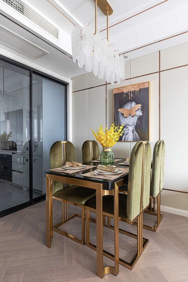 餐厅延续了客厅的低调轻奢风,硬朗流畅的线条对墙面进行了勾勒和渲染,简约轻奢的金属长餐桌,搭配有着墨绿丝绒弧形椅背的餐椅,反射出低调而精致的轻奢感,仿佛置身热带雨林,大片的叶子,生机勃勃。