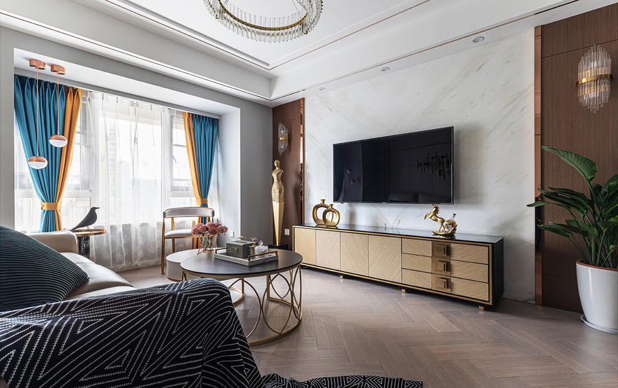 电视墙选用了刻意留白的岩板墙,质感轻奢雅致,花纹若隐若现,暗藏玄机,添加以金属、琉璃、绿植等元素,呈现出一种融合的美感。