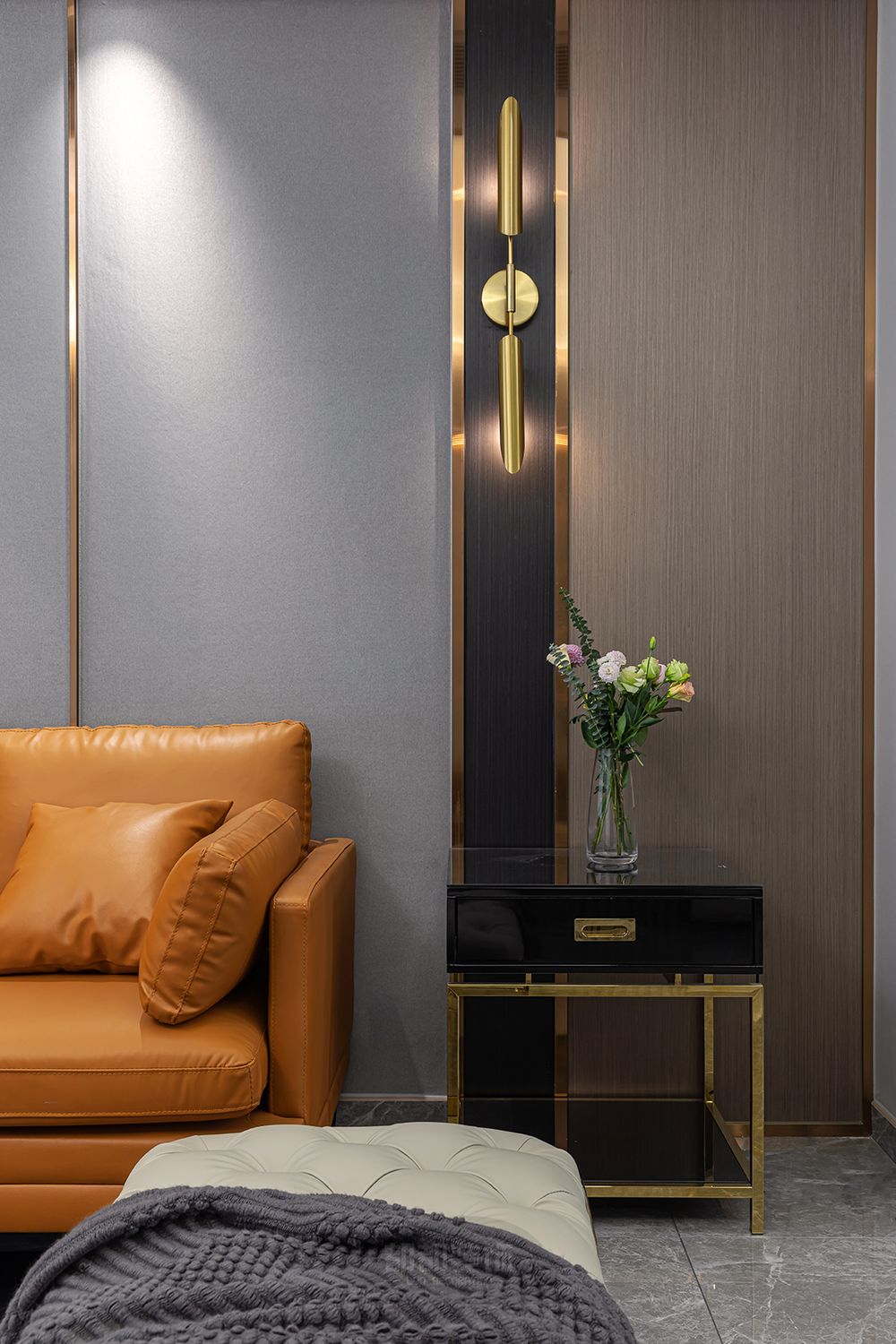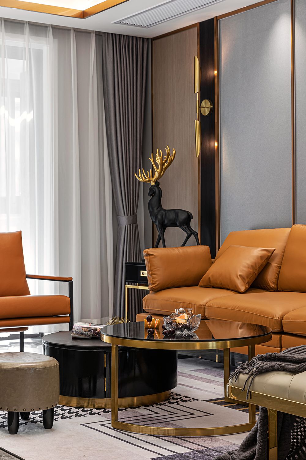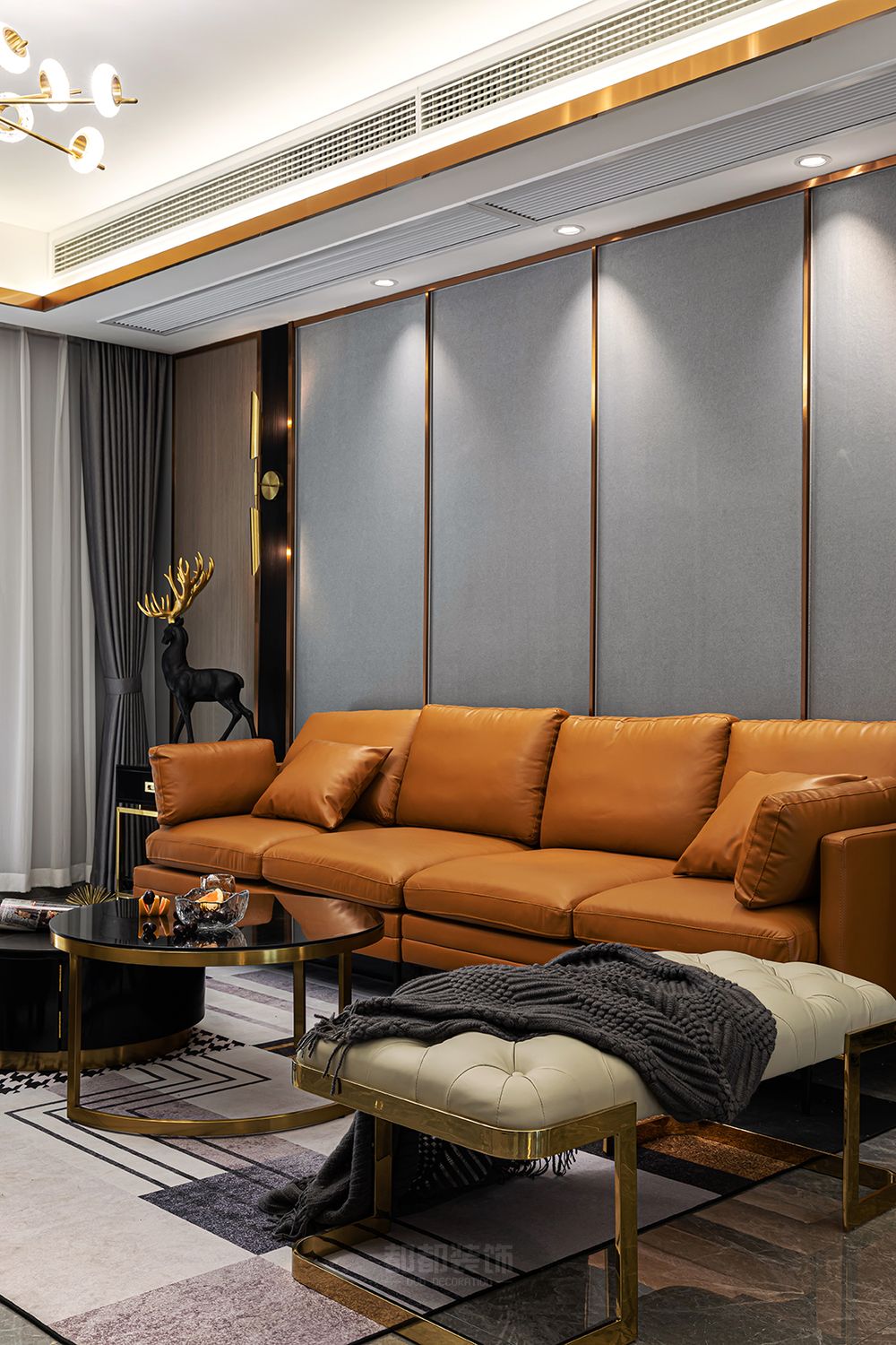 ▲空间随处可见的金属元素与灰色的经典搭配作为沙发背景墙,豪华又舒适,加州橙皮质多人位沙发与单人沙发点亮空间的温度,黑色亮面的茶几加入金属点缀,干练沉稳。