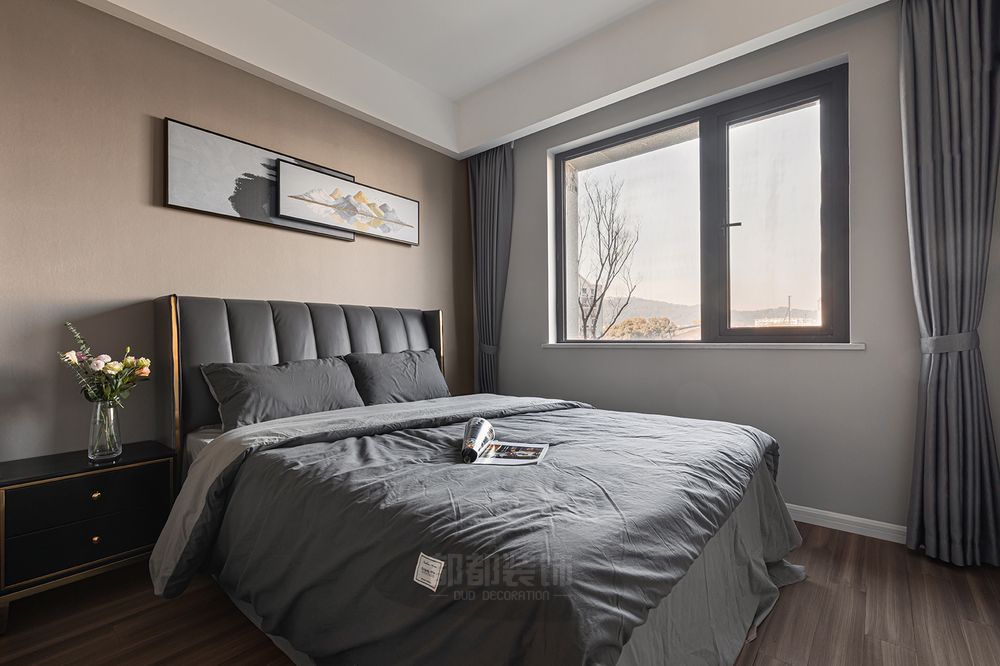 ▲主卧与次卧的色调设计都为低饱和的灰色系,灰色的窗帘与床品搭配,柔和大气。