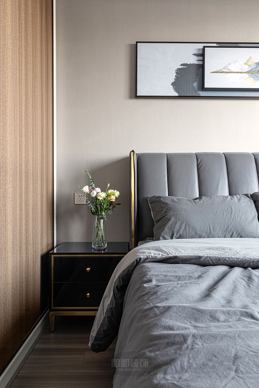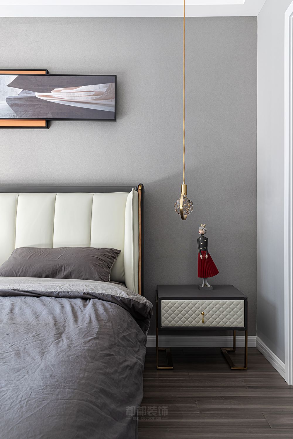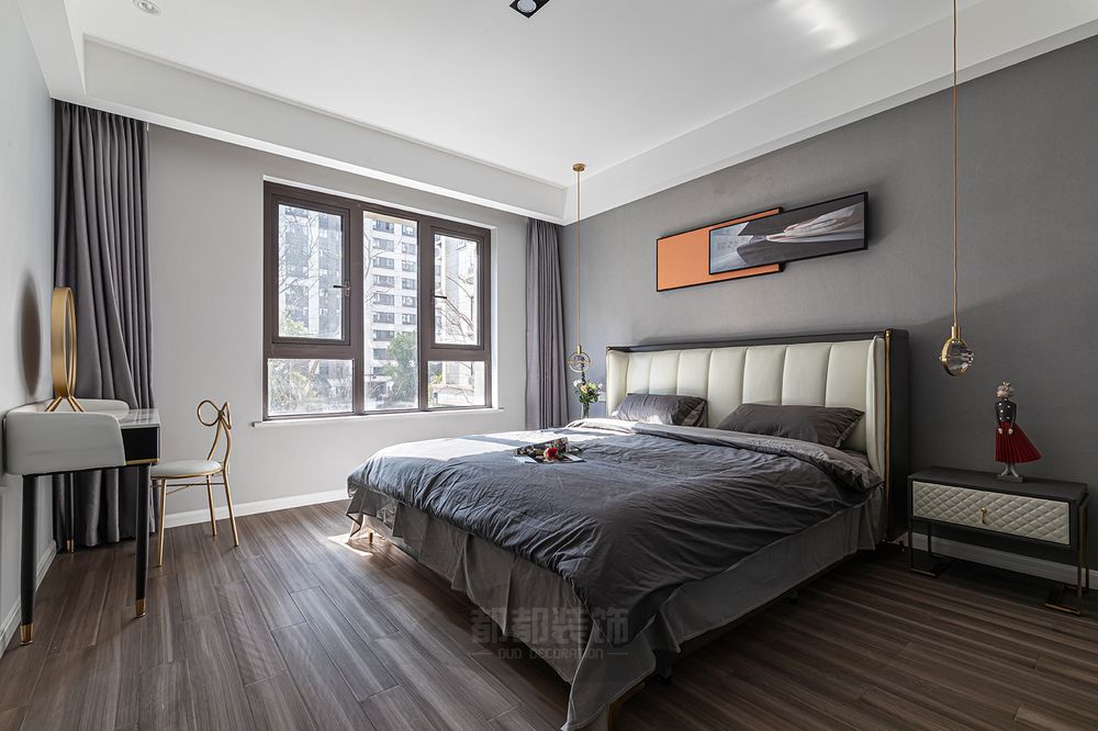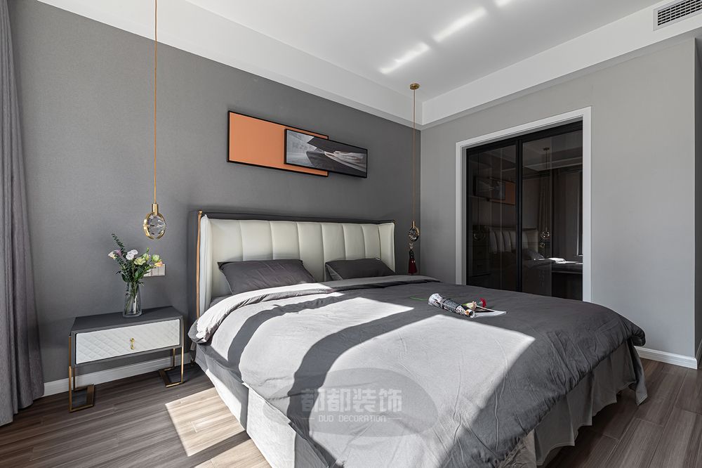▲卧室以舒适为主,灰色为主调,橙色床头挂画点亮空间的色彩温度,木地板铺设,白色软包床头舒适大气。