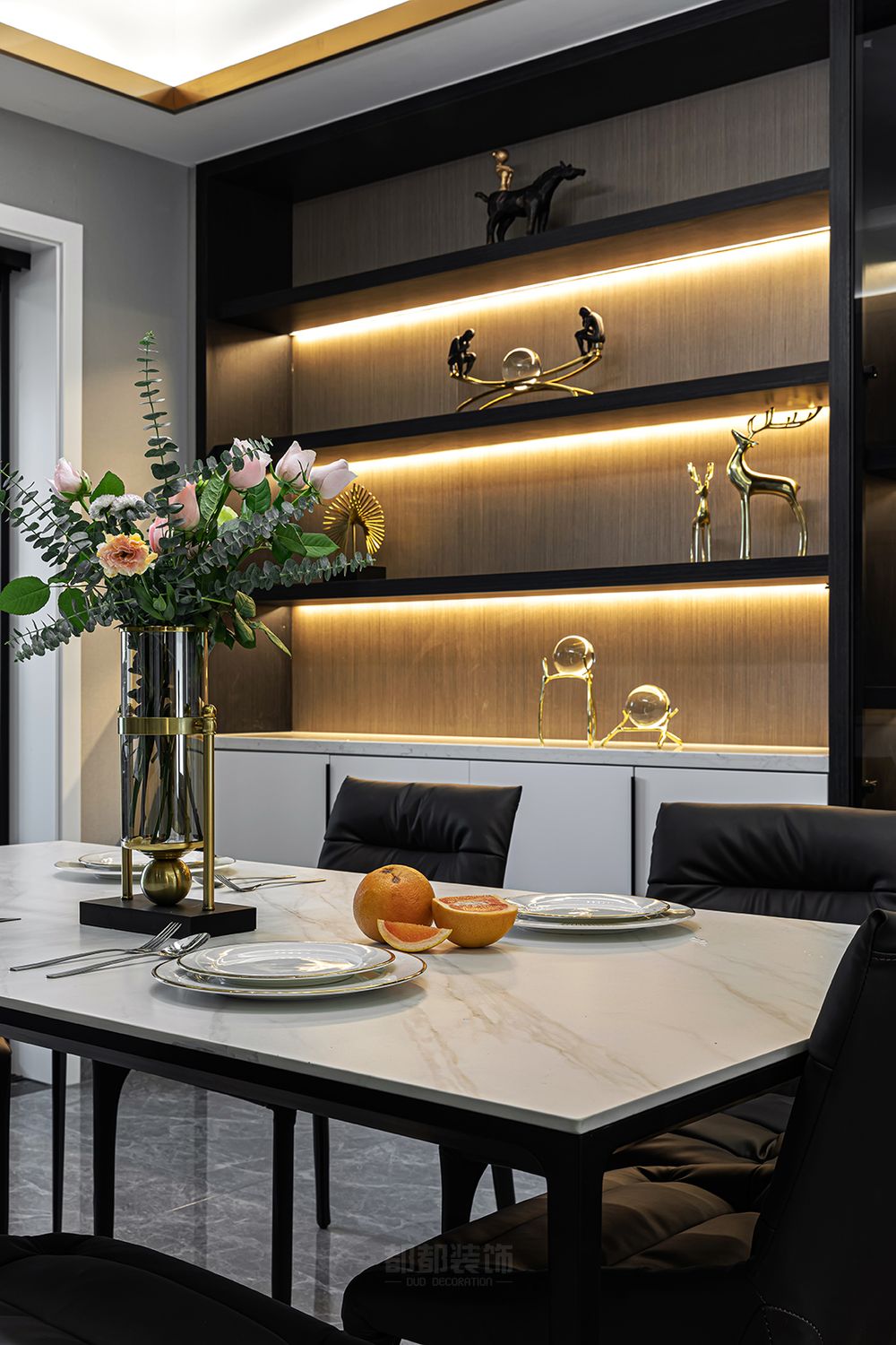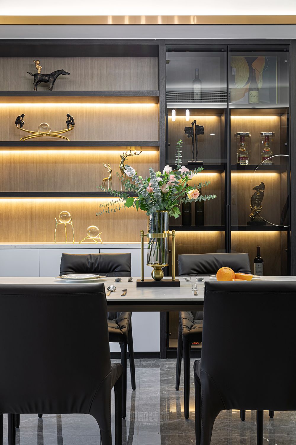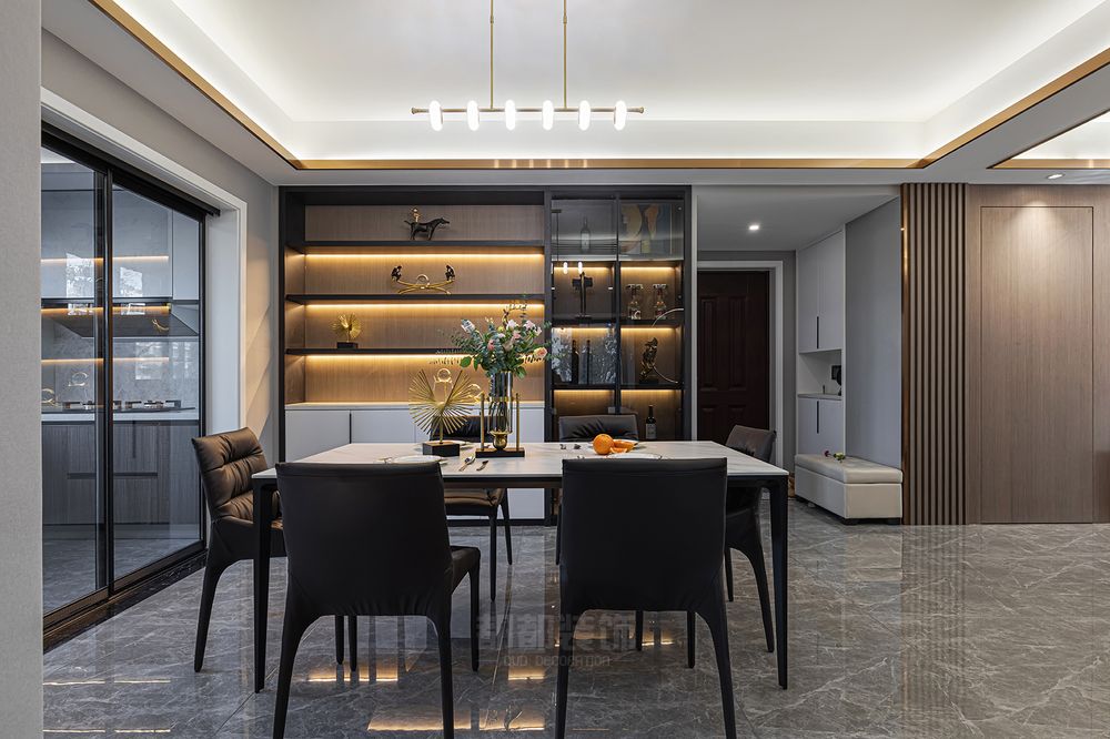 ▲设计师将客餐厅设计打通之后,由灰色、棕色、金属色协调搭配,入户视觉宽敞通透,呈现出了一个惬意休闲的轻松氛围,流露的轻奢质感让生活显得更加品质高档。