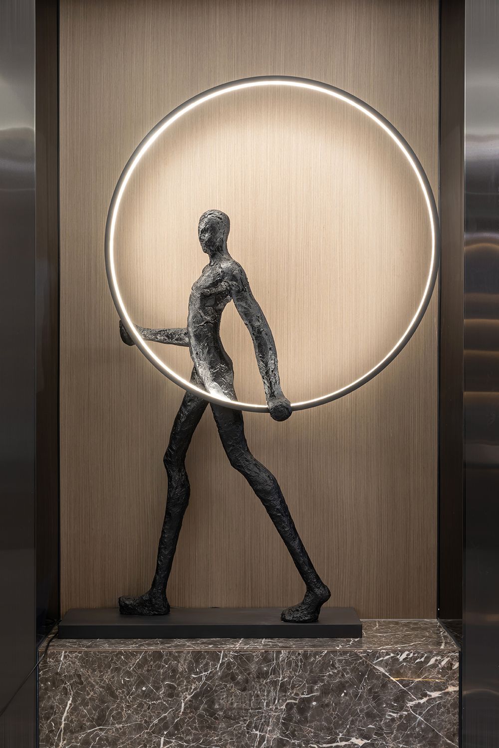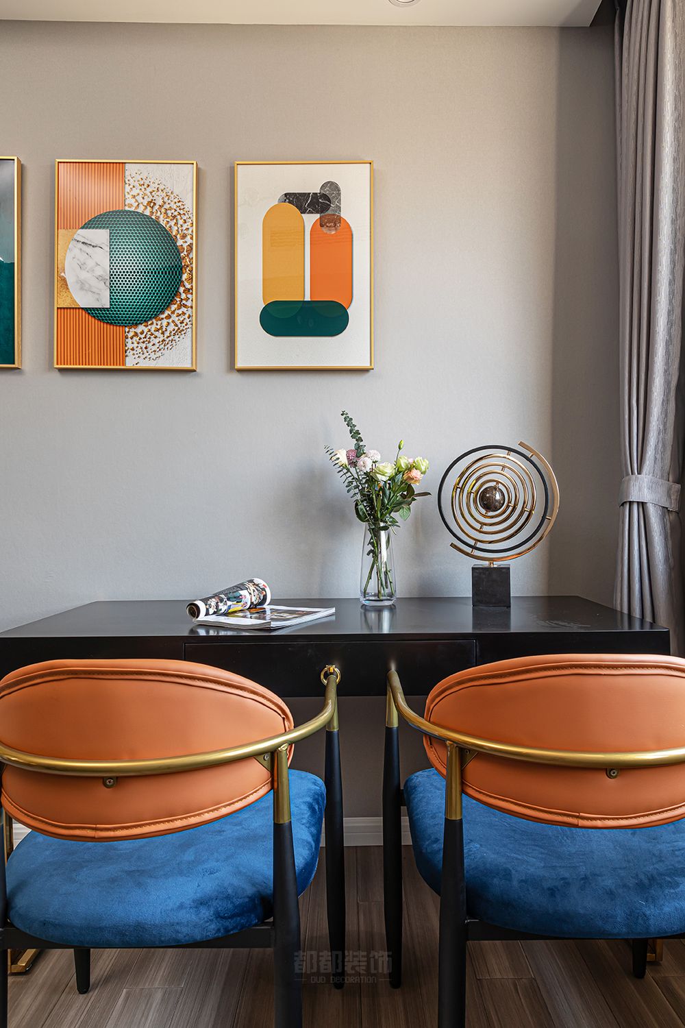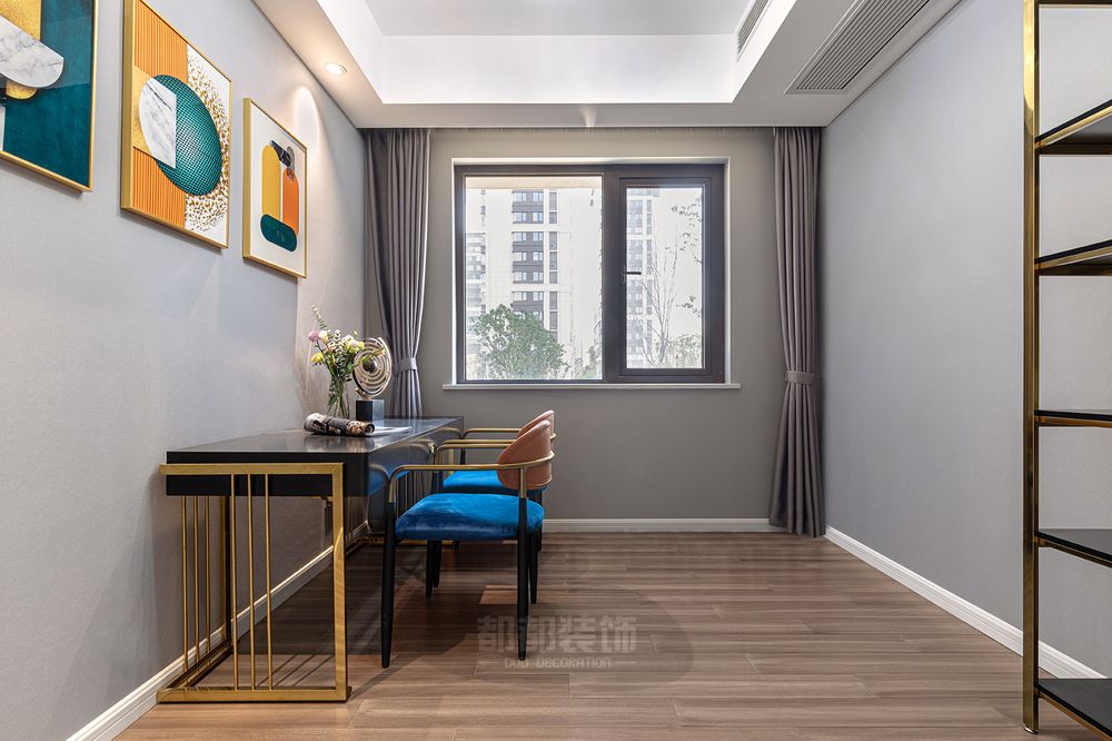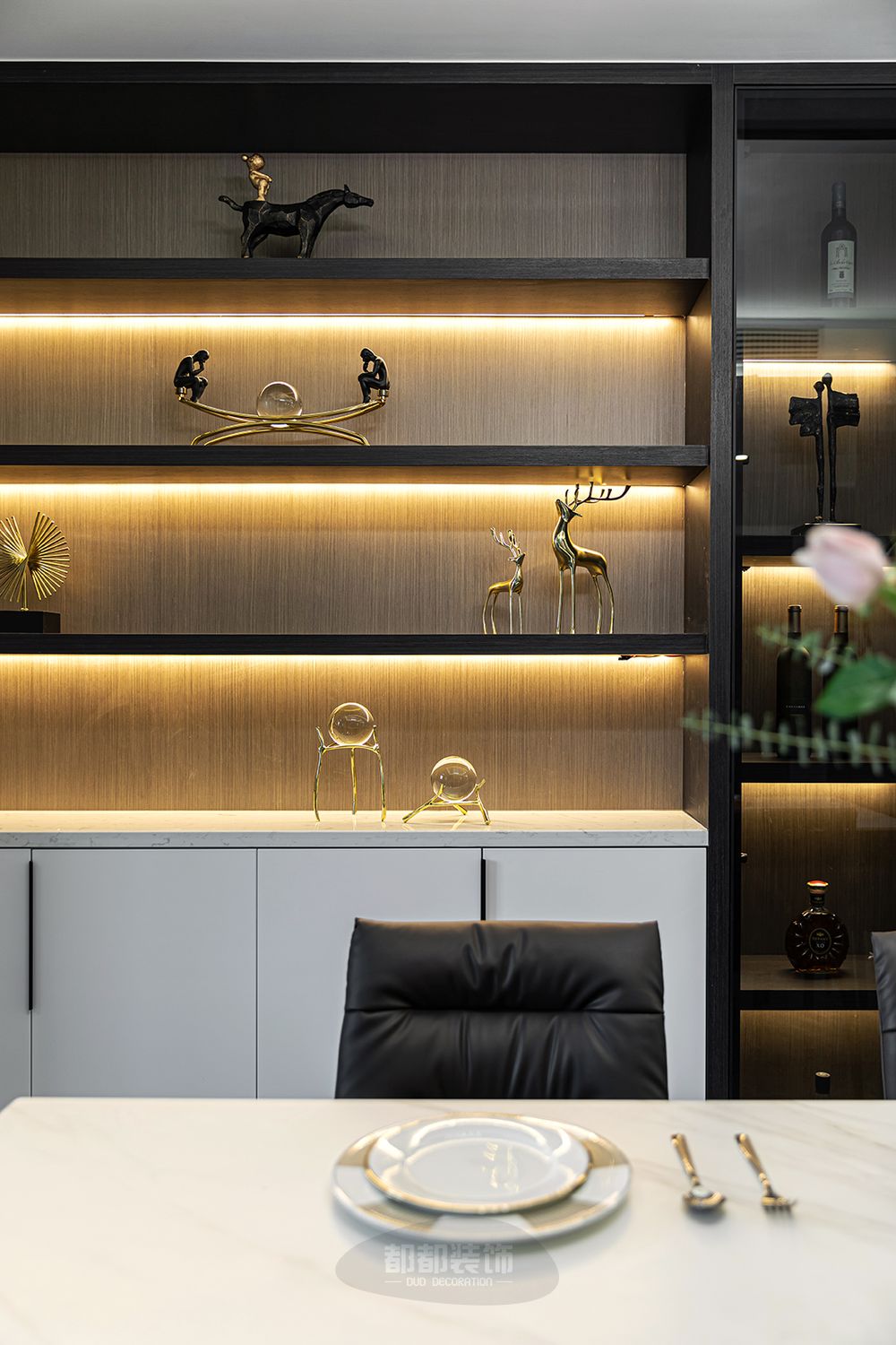 ▲设计师将客餐厅设计打通之后,由灰色、棕色、金属色协调搭配,入户视觉宽敞通透,呈现出了一个惬意休闲的轻松氛围,流露的轻奢质感让生活显得更加品质高档。