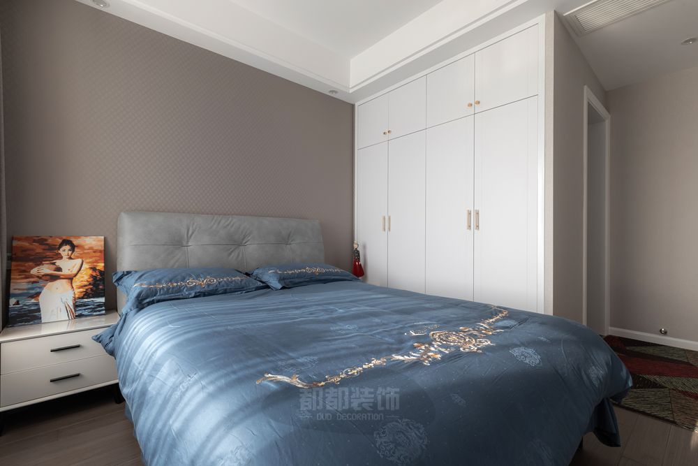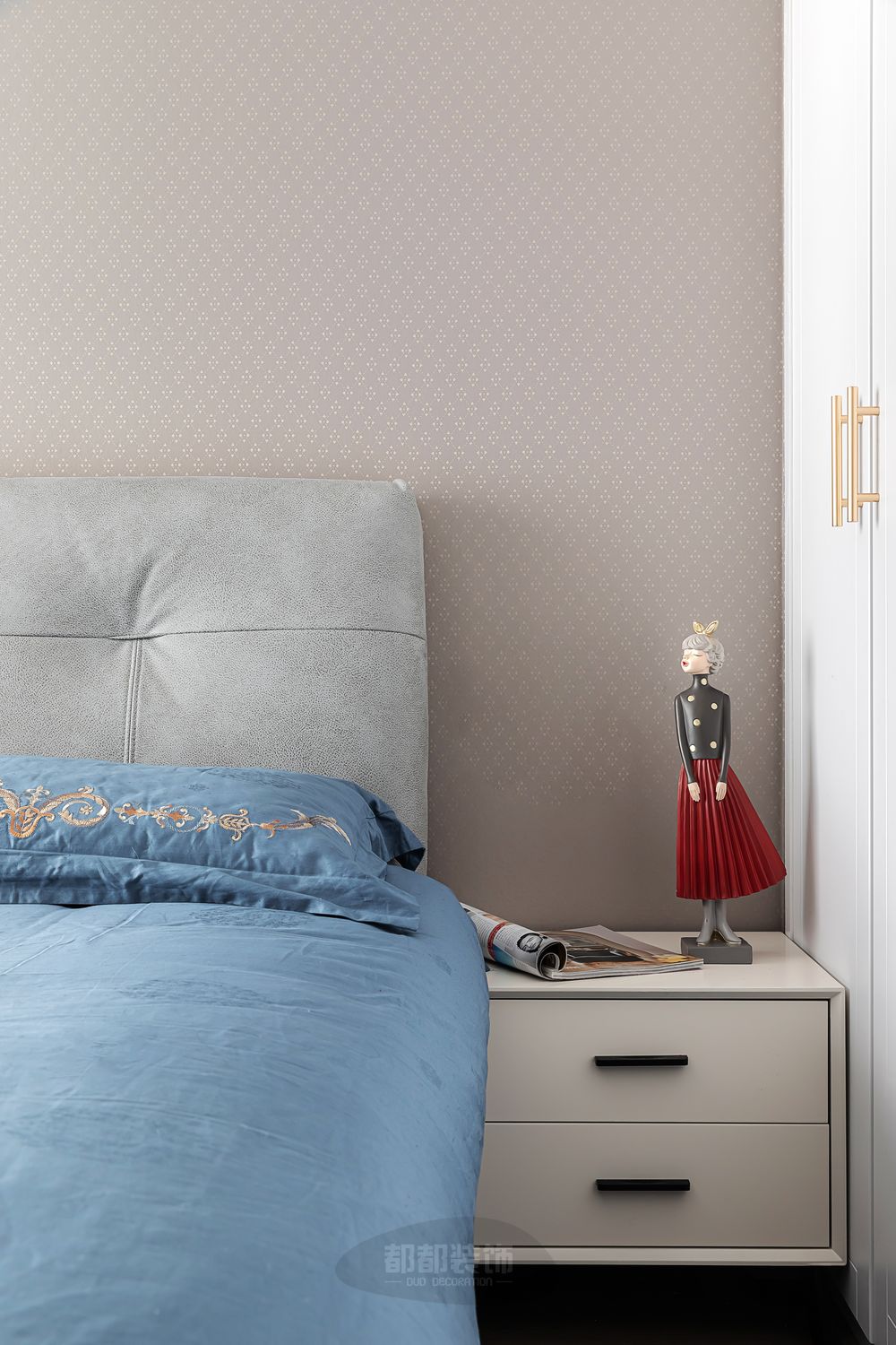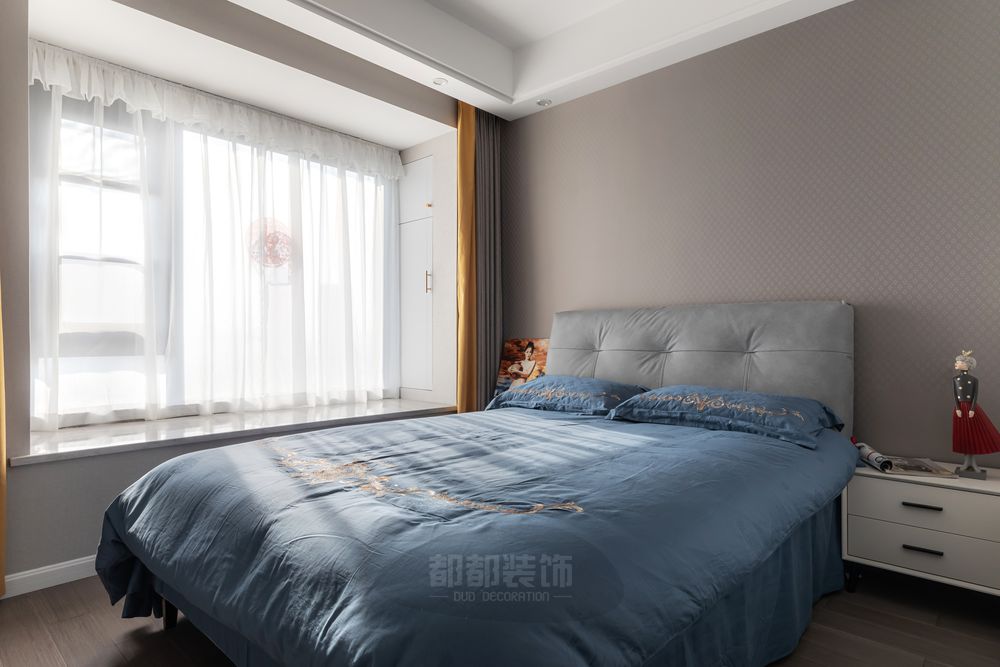 ▲卧室的大飘窗使室内明亮通透,灰咖色的床头背景墙,蓝色的床单,搭配白色的衣柜,让空间显得宁静而优雅。