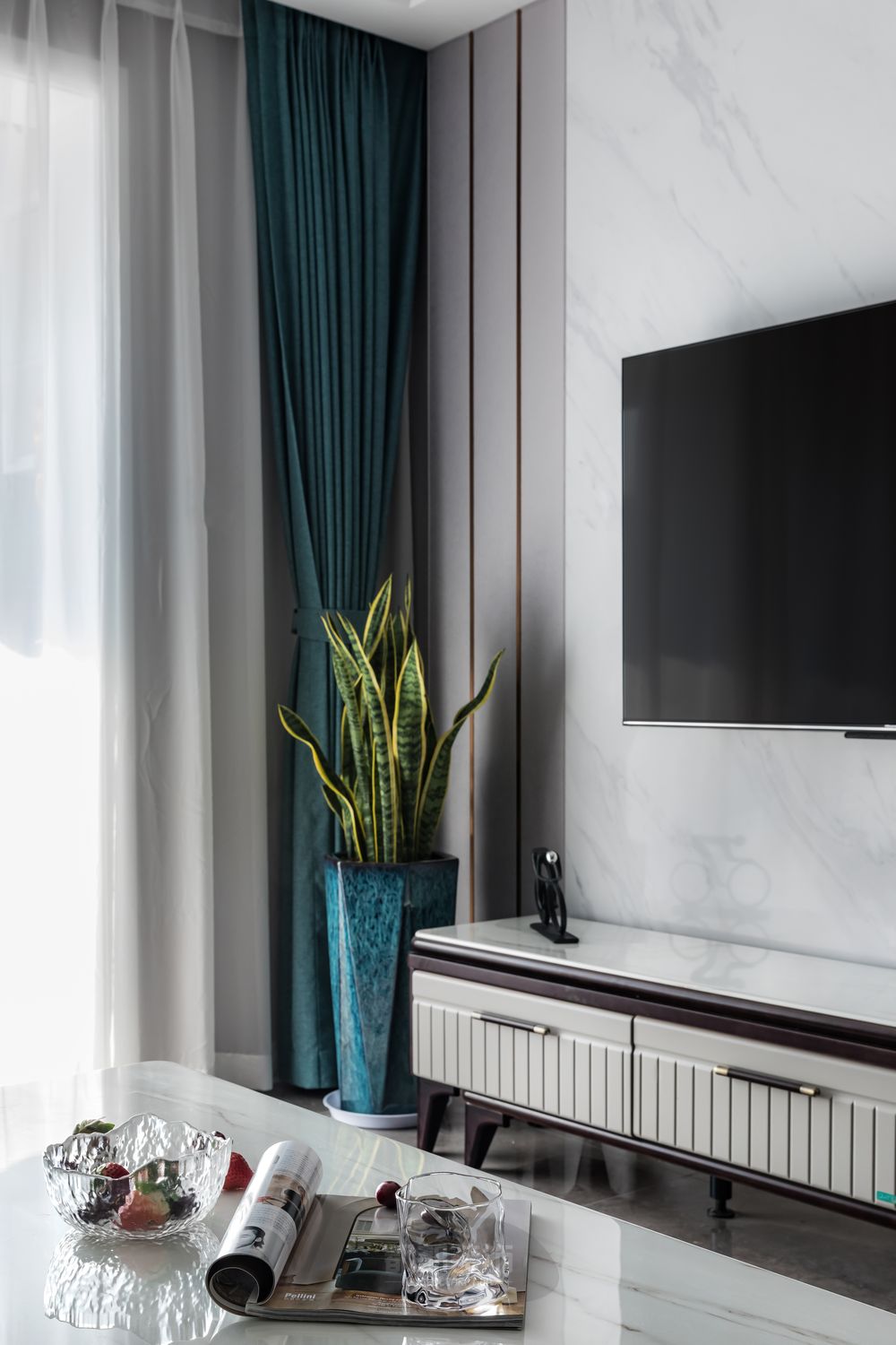 ▲客厅的落地窗让采光和通风性大大加强,客餐厅打通,合理利用空间。在电视墙的处理,设计师巧妙的利用留白艺术设计,简单的墙面,搭配上电视柜与绿植点缀,留下无尽的想象空间。