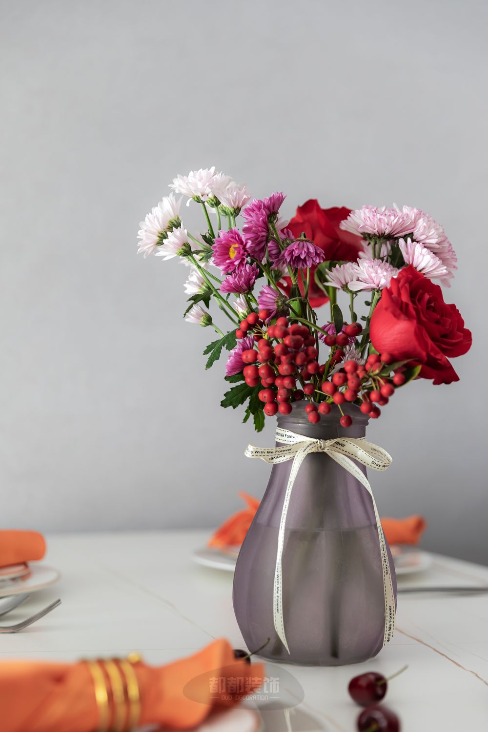 ▲方寸之地亦显天地之宽。吊灯、桌、椅、鲜花、碗、浅灰的墙壁,构成含蓄而内敛、简单而安闲的餐厅环境。