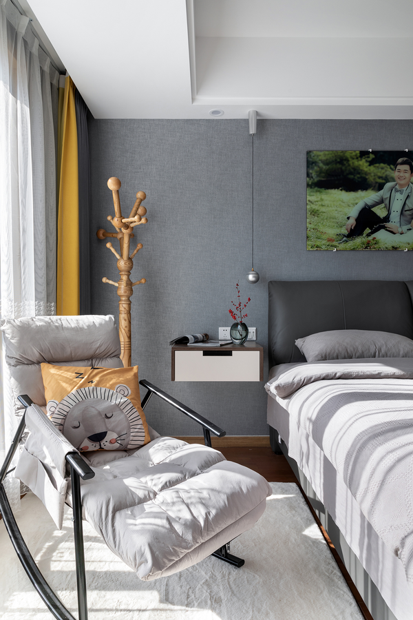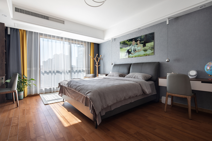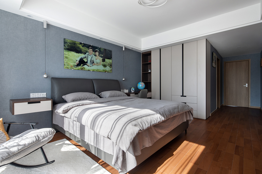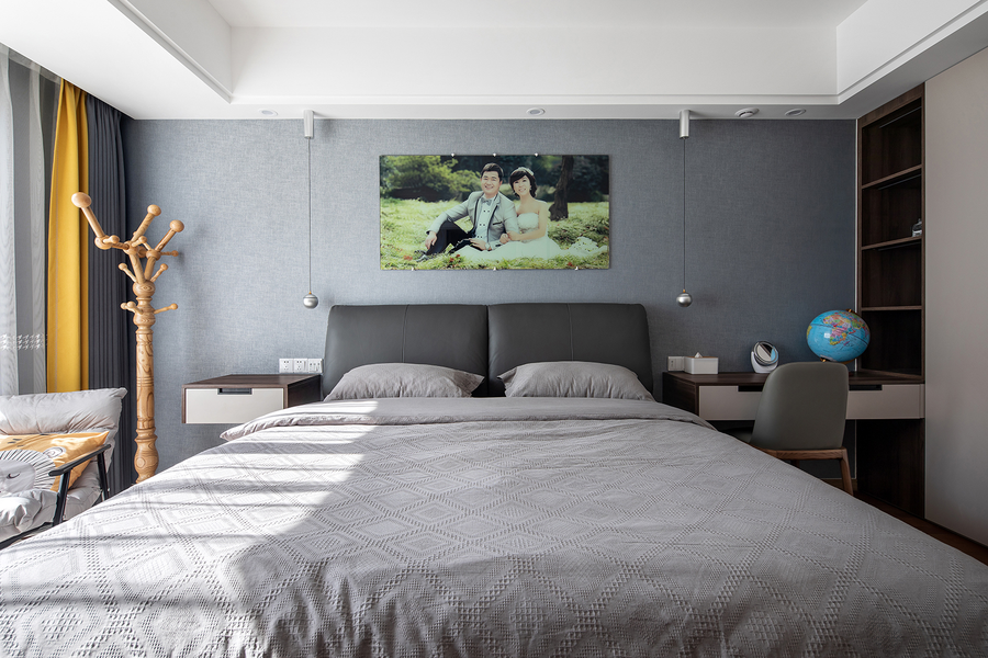 主卧的氛围温馨,绅士灰的墙头背景墙上挂着一幅结婚照,浅灰缎面的床上用品,亲肤又柔软,整个空间都散发出甜蜜浪漫的氛围,配上简洁干净的原木床头柜,让空间显得宁静又优雅。