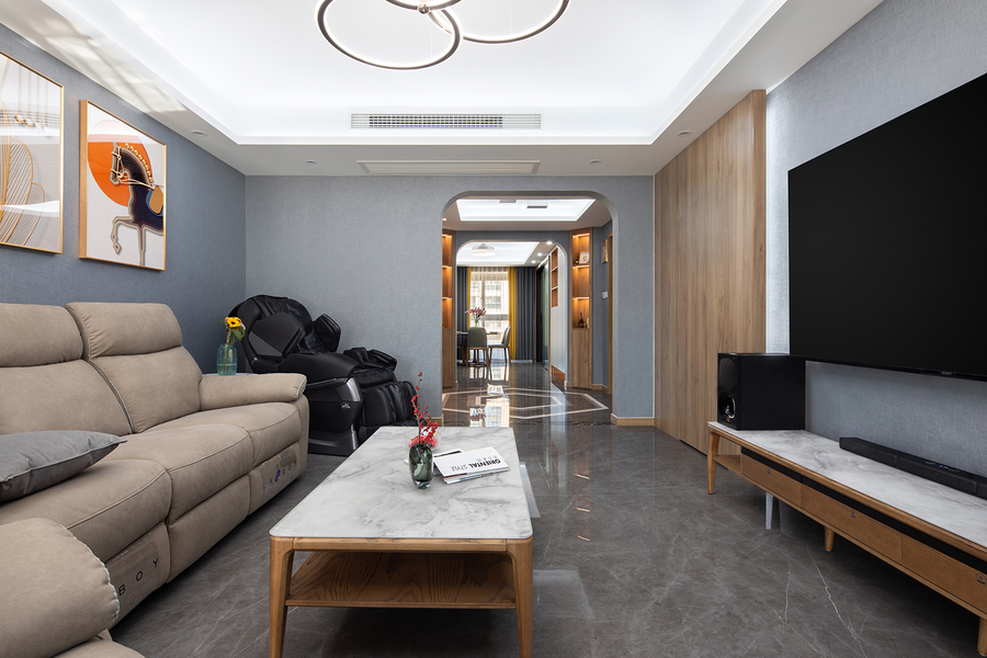 拱形门隔断的的设计,使房间充满设计感和神秘感,空间内部以饱和度低的灰蓝色铺陈,温润自然的原木色与其相得益彰,利落的线条贯通南北,简约大气,呈现出时尚而不失精致的风格样貌。
