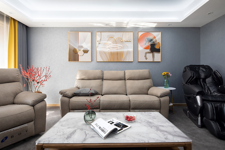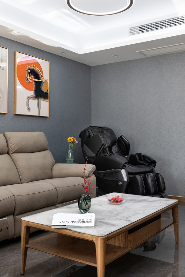 柔和的皮质米色沙发,宽大舒适,点缀以不经意布置的绿植与干花,静谧的空间流畅出一曲活泼明快的小调,随手翻开的杂志,洗净的水果,立在角落的电动按摩椅,充斥着主人对生活无比的赤城,满满的温馨气息。