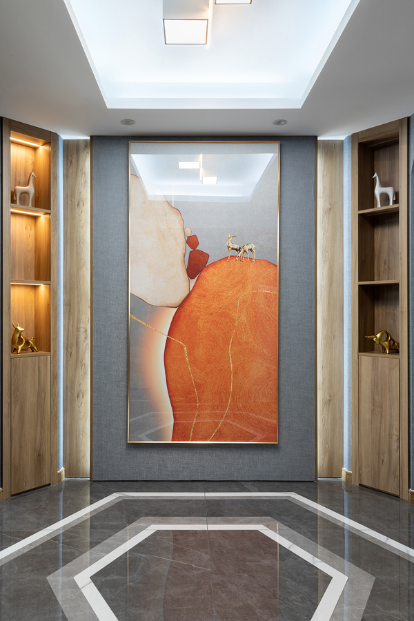 入户空间呈开放式,设计师利用两扇拱门墙隔开客厅和厨房,开辟出一个兼具美观储物的玄关。正对的挂画时髦,木质储物柜内摆件整齐有格调,内藏灯带温馨柔和,一开门就给人一种发自内心的愉悦仪式感。