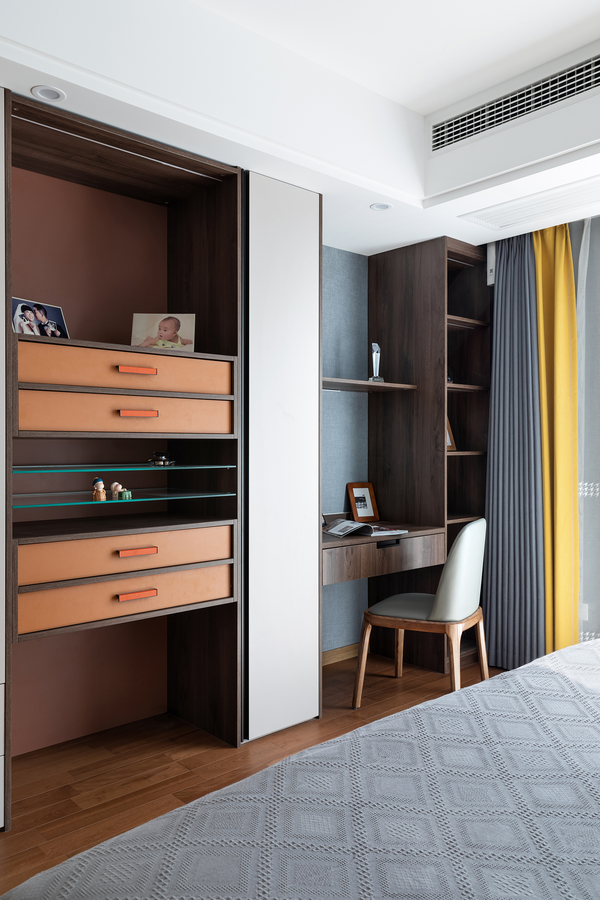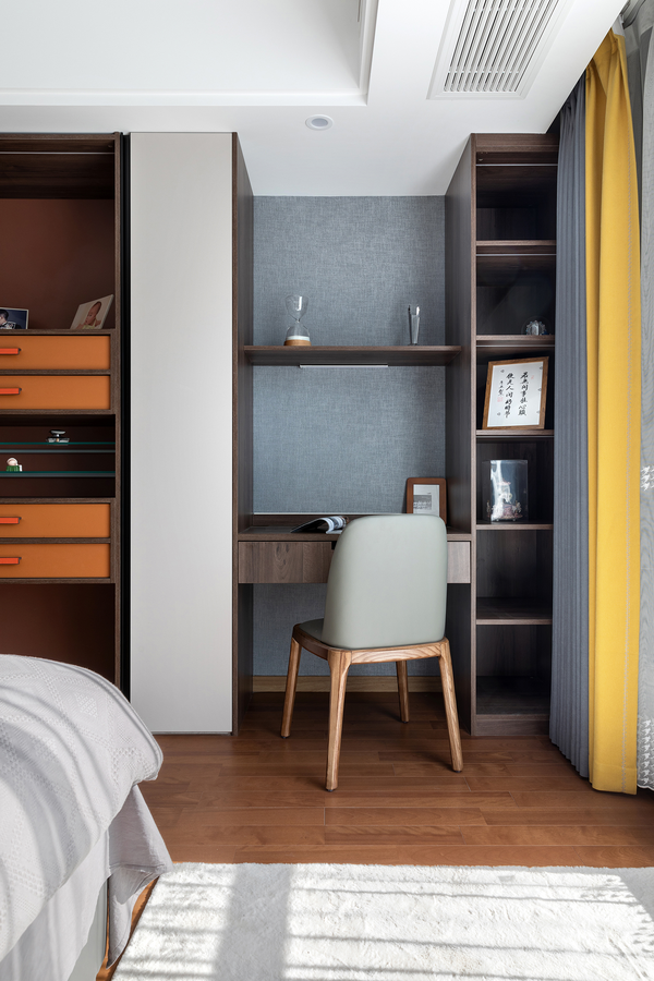卧室书房一体,充分压榨每一寸的空间,次卧靠墙改造成为带办公桌的一体化设计,一部分用于摆放照片抽屉等,留出一部分作为办工作,增加实用性的同时整体空间感也更有层次感,满足了业主可以工作学习休息一体的愿望。