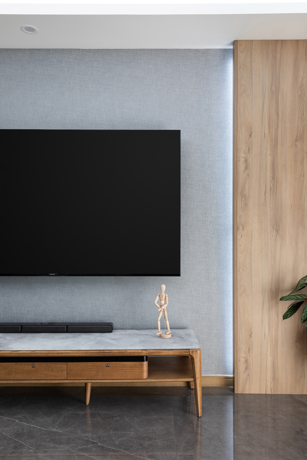 电视墙用浅蓝色系与温馨的实木材质作为混搭,细脚电视柜轻盈优雅,搭配大理石柜面,一冷一热,整个材质的选择丰富而又格调,绿植随意一捧插入藤编的花篮中,温润自然,视线所到之处尽显层次美感,