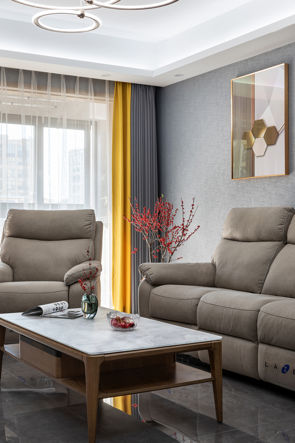 客厅以素色为空间底色,穿插明黄和黑色,在浅灰的皮质沙发与时尚前卫挂画搭配下,营造出极简的现代氛围。大理石地板利落给空间带来开阔明亮的视觉效果,透过一层薄纱,太阳光洒落一室,注入温润风情。