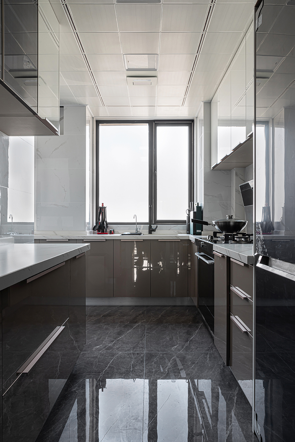厨房同样延续黑白灰风格,上下橱柜大大增加储物空间,水槽、洗碗机、蒸烤箱等一应俱全,方便日常烹饪备餐。