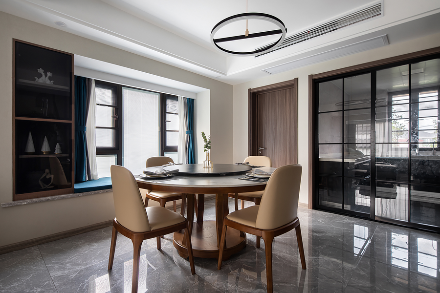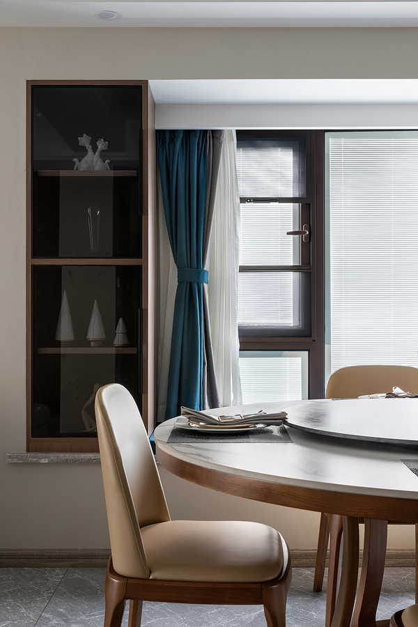 颜色浓度和谐整体的木质和蓝白相间的窗帘让空间质感更加丰富,整个空间的软装克制而高级,咖色实木圆桌搭配四把同类型的餐桌椅,颜色沉稳时尚,蔓延着主人的文艺情怀。