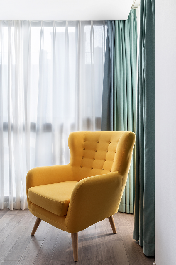 老人房背景墙选了高级灰,沉稳低调,搭配黑色皮质奶咖色,阳光照射的地方摆放了一张姜黄色单椅,素雅中透出一丝活泼,留给主人享受独处时光。