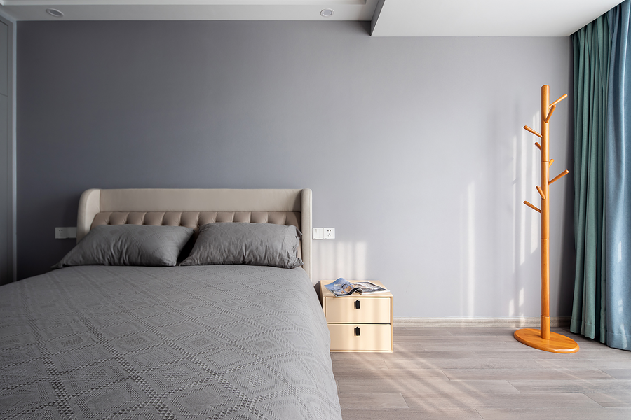静谧蓝通涂墙面,给人以大海般的平静浪漫,配上自然的原木地板,空间内瞬间有了温度,同样软装的选择上也去繁留简,没有过多的造型和拖沓的软装,太阳光穿透窗帘且洒落一室,带来明净、宽敞的空间感。