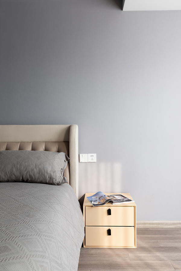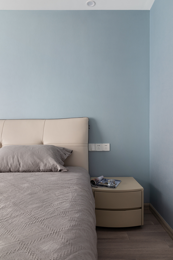 与床头同类型的皮质床头柜上时尚简约,干净利落又不失家的温馨感,柜面上摆放着昨晚睡前随手翻阅的书籍,角角落落都是生活的气息。