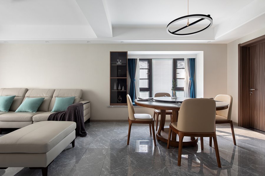 餐厅与客厅保持相近配色,整体搭配很和谐,餐厅背景墙以卡座的形式呈现,打造出轻松愉悦的生活状态,灯、桌、椅、餐边柜、素雅的墙壁,构成含蓄而内敛、简单而安闲的餐厅环境。