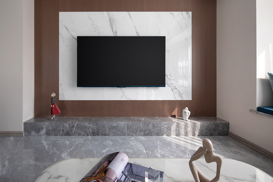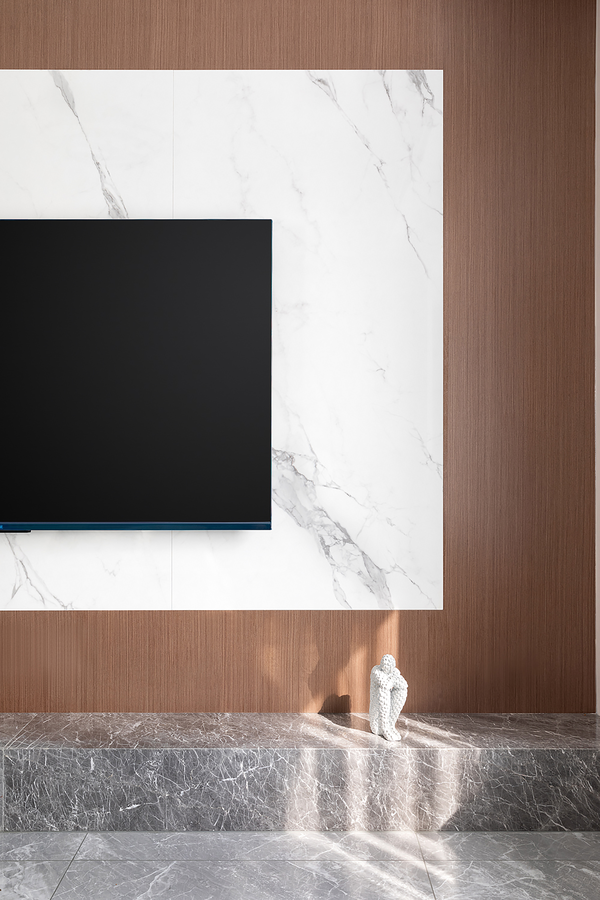 电视墙黑白色搭配凌厉不啰嗦,木饰面清新雅致,整面造型更显年轻有格调,同材质绅士灰大理石台面,可以摆放一些艺术摆件,增添了空间的趣味性和层次感。