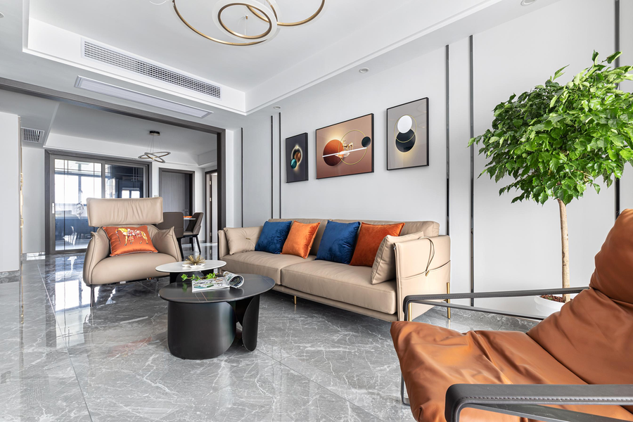 客厅的落地窗揽入自然光,以高级灰家大理石白为硬装配色,简洁现代,让客厅空间看起来宽敞明亮之余,更添现代时尚之感。