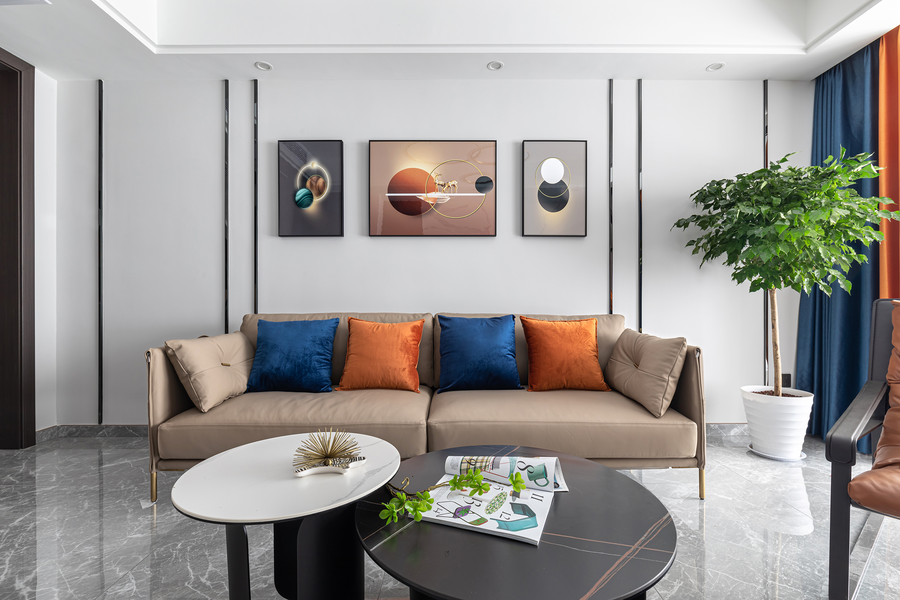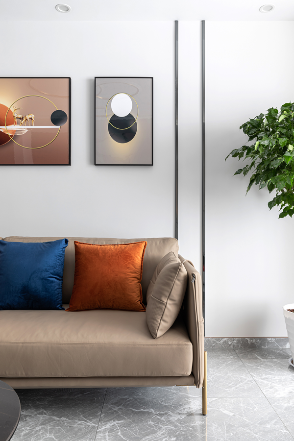 精心挑选的艺术挂画看起来格调又有质感,同抱枕中的亮色相呼应,赋予了这个家个性、摩登、极具艺术感的新视觉。