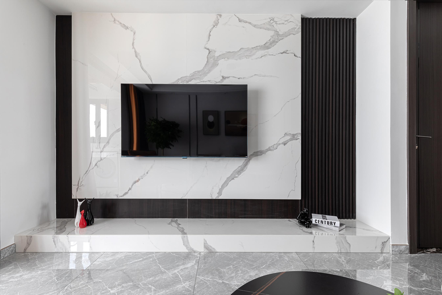 灰白调大理石电视背景墙,线条利落,下方抬高多出储物空间,摆上精致华丽的陶艺品,多了几分不规则艺术感。