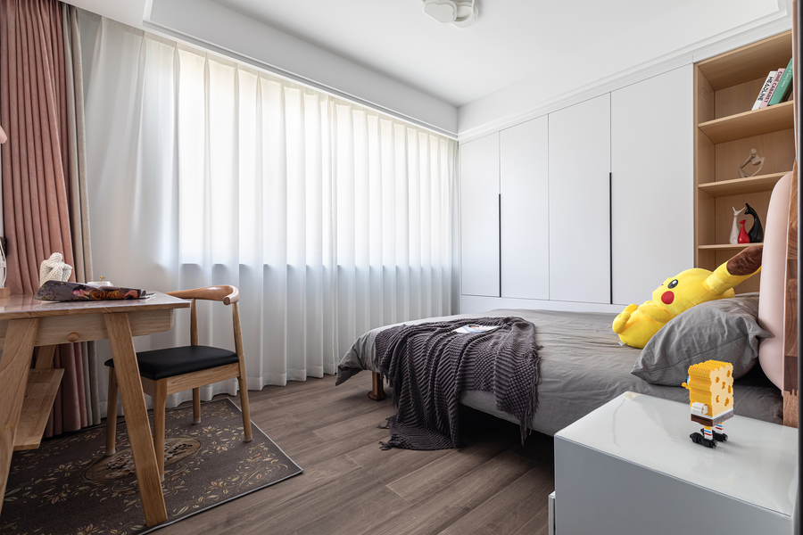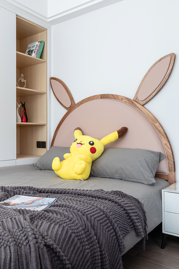 女儿房延续男孩房的风格,白色与木色的搭配雅致轻盈,皮卡丘样式的床让整个空间拥有了更多个性和童趣。