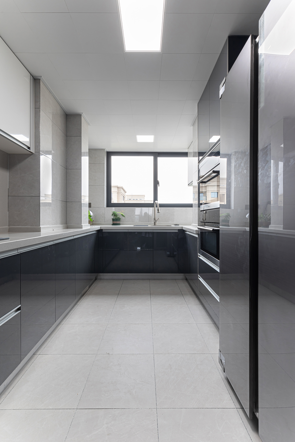 U形橱柜占地面积小,黑色底柜搭配顶天白色吊柜,搭配时尚耐看,使用效率高。
