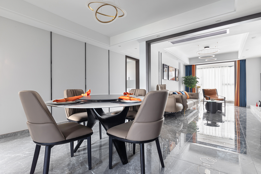 客厅与餐厅呈开放式形式,南北胡同,采光更好,互动更强,风格上延续了客厅的整体效果,但没有过多的装饰,打造出一个更为温馨现代的用餐空间。