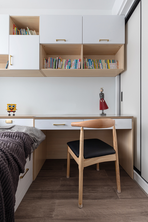 儿童房因为空间受限,设计师选择了榻榻米的设计,储物空间增大,吊顶书柜和连体书桌构成一个私密小空间,对于想要快快长大的小孩来说,大概是最完美了吧!