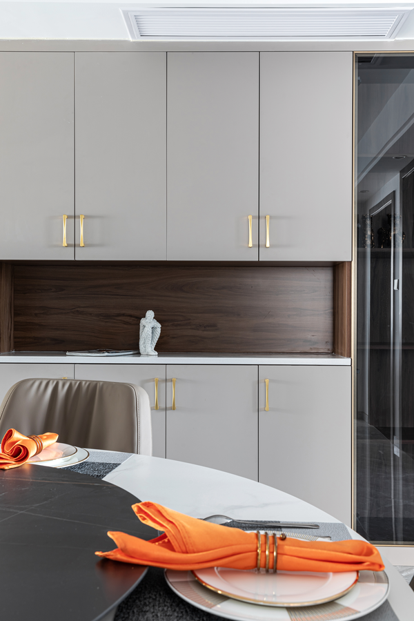 餐桌选择了圆形餐桌,更符合中国人的“圆满”,灵活运用墙体嵌入顶天立地的木色储物柜,扩大了空间层次感的同时,各种杂物都拥有了最佳的容身之地。