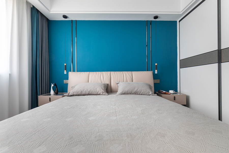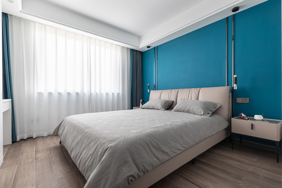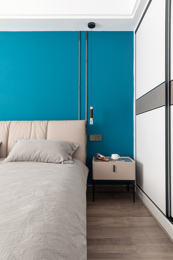 卧去繁留简,大胆运用极具现代的湖蓝色,两侧吊灯垂落而下,不需要浮夸的样式,营造出清新明快的空间感,加以温润木色地板,给予空间温暖的触感。