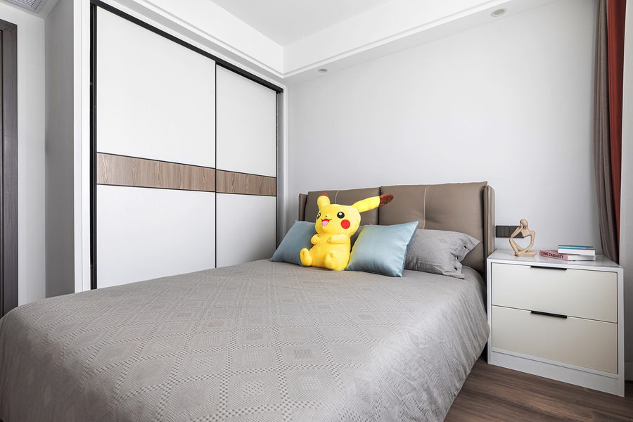 老人房选择了更为沉稳的灰色系,简单舒适不多加修饰,与主卧相比整体配色浓度相对减弱,更能使老人在休憩中感受到宁静温暖的气息。