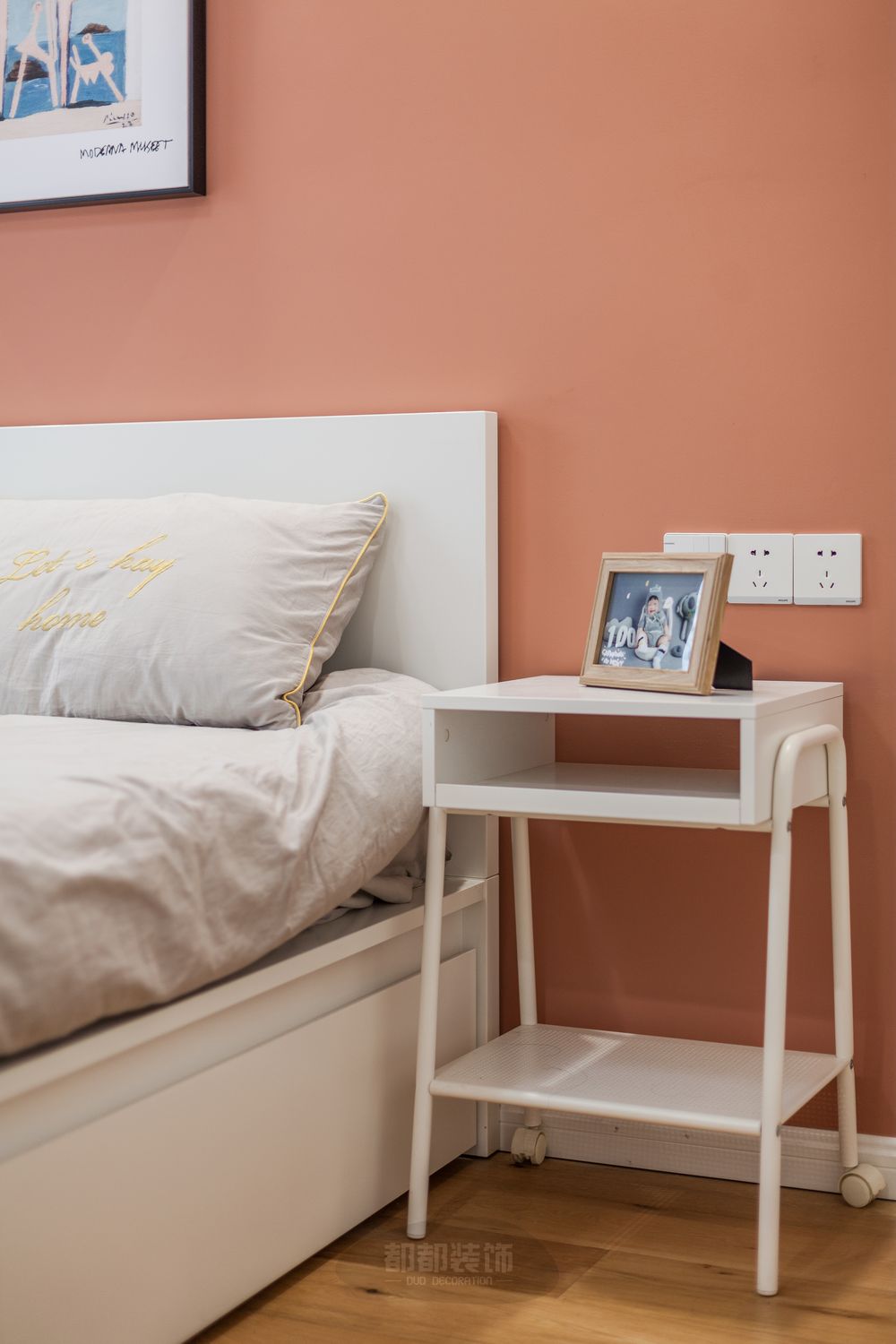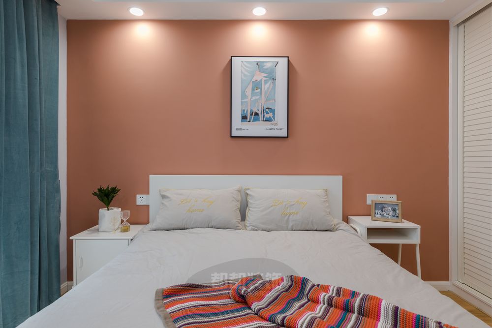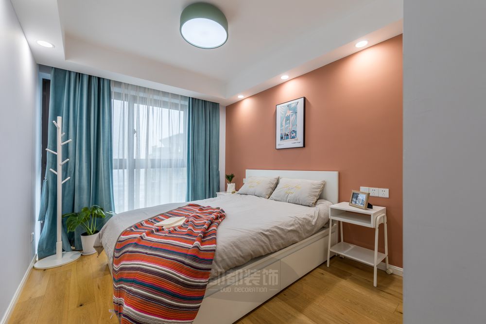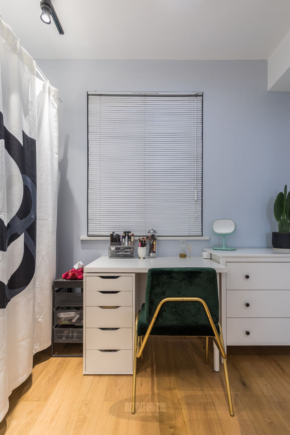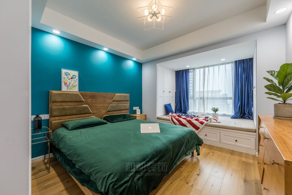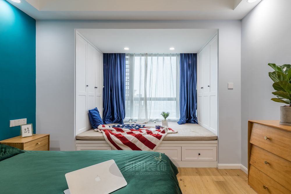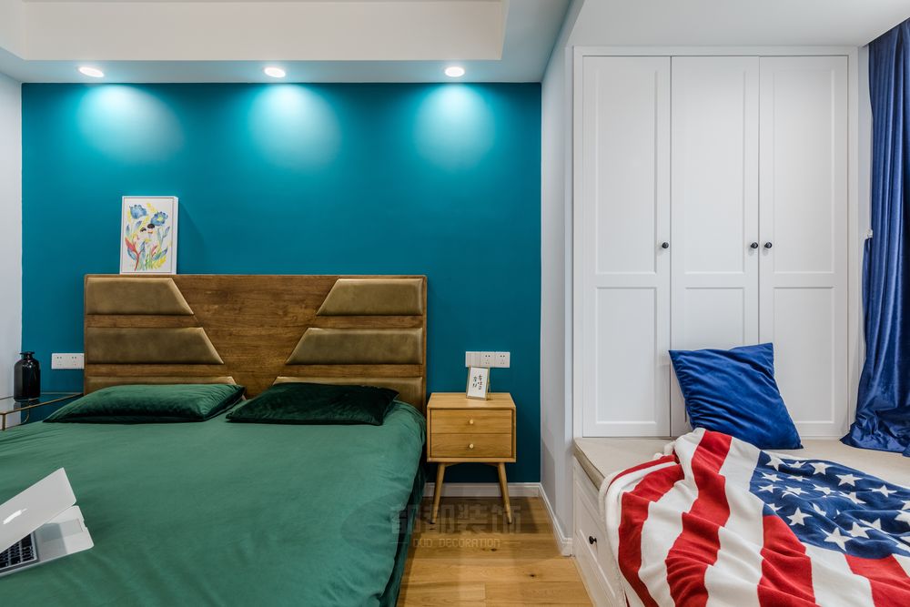 ▲寝卧,选用了蓝绿色作为主墙色彩,与亮眼的飘窗窗帘相映成趣,搭配略带复古的家具柜体,木质储物柜。