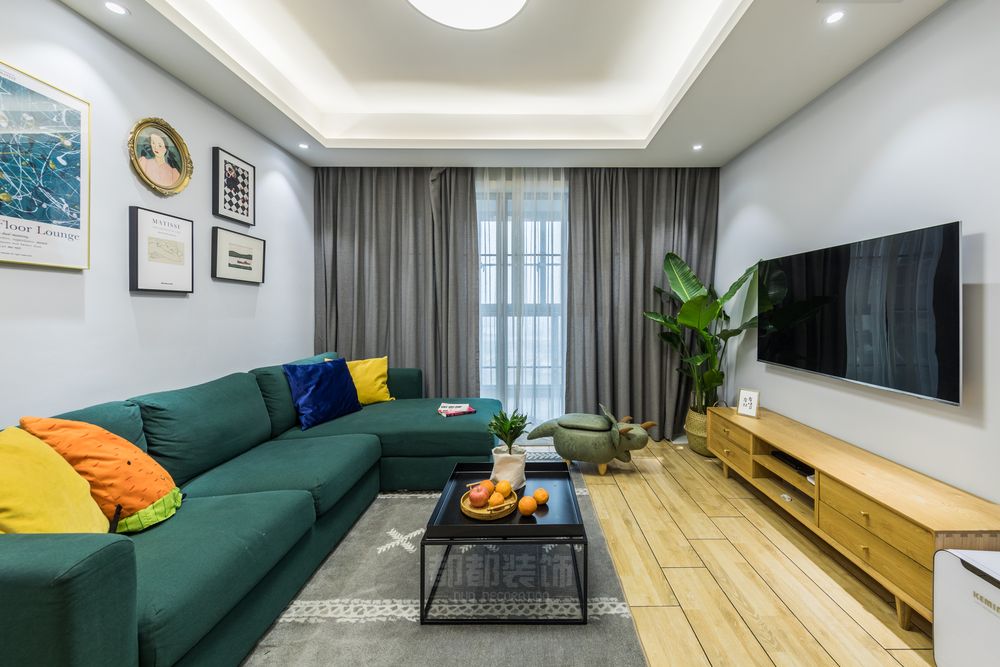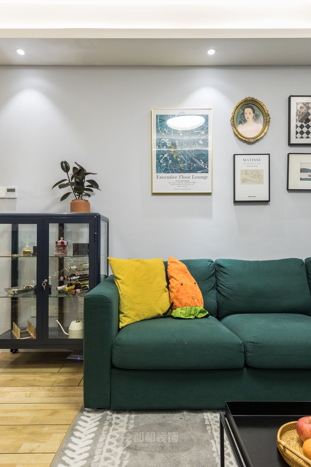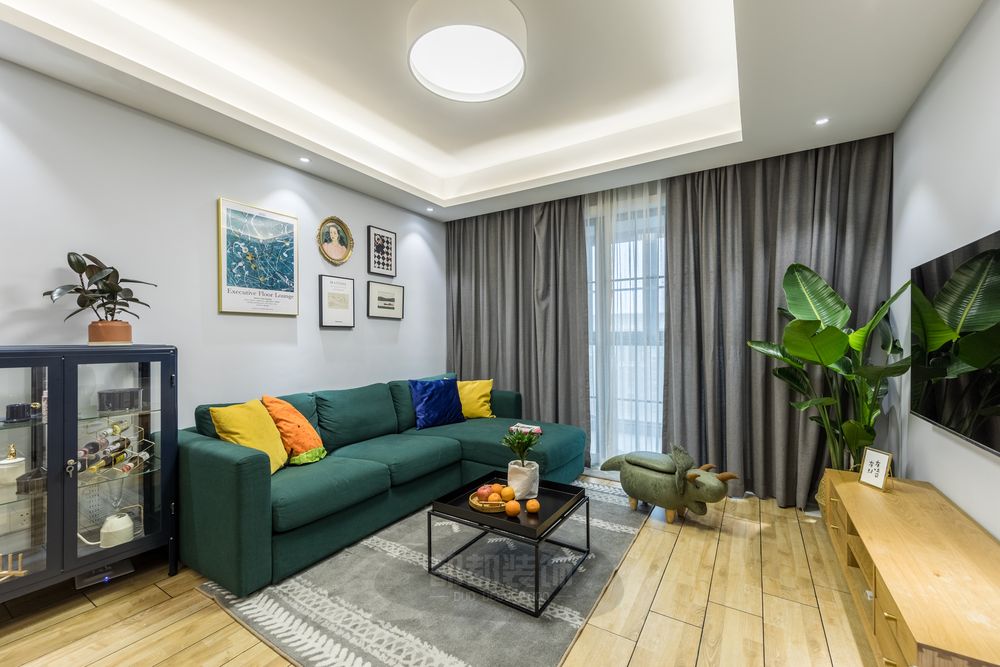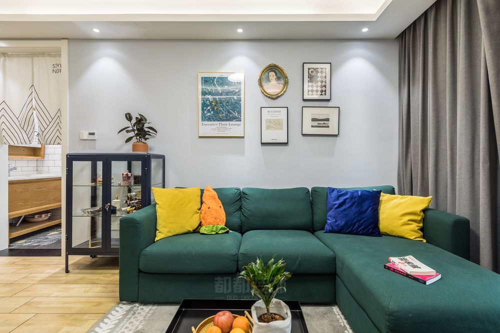 ▲本案空间小巧精致,亮眼不失沉稳的深绿色沙发,亮黄色的抱枕,复古与简约壁画来回贯穿,形成舒适的视觉效果。木质地板,几何撞色的毛绒地毯,玻璃黑框储物柜,黑色茶几,健硕生长的绿植构成了家的第一印象。