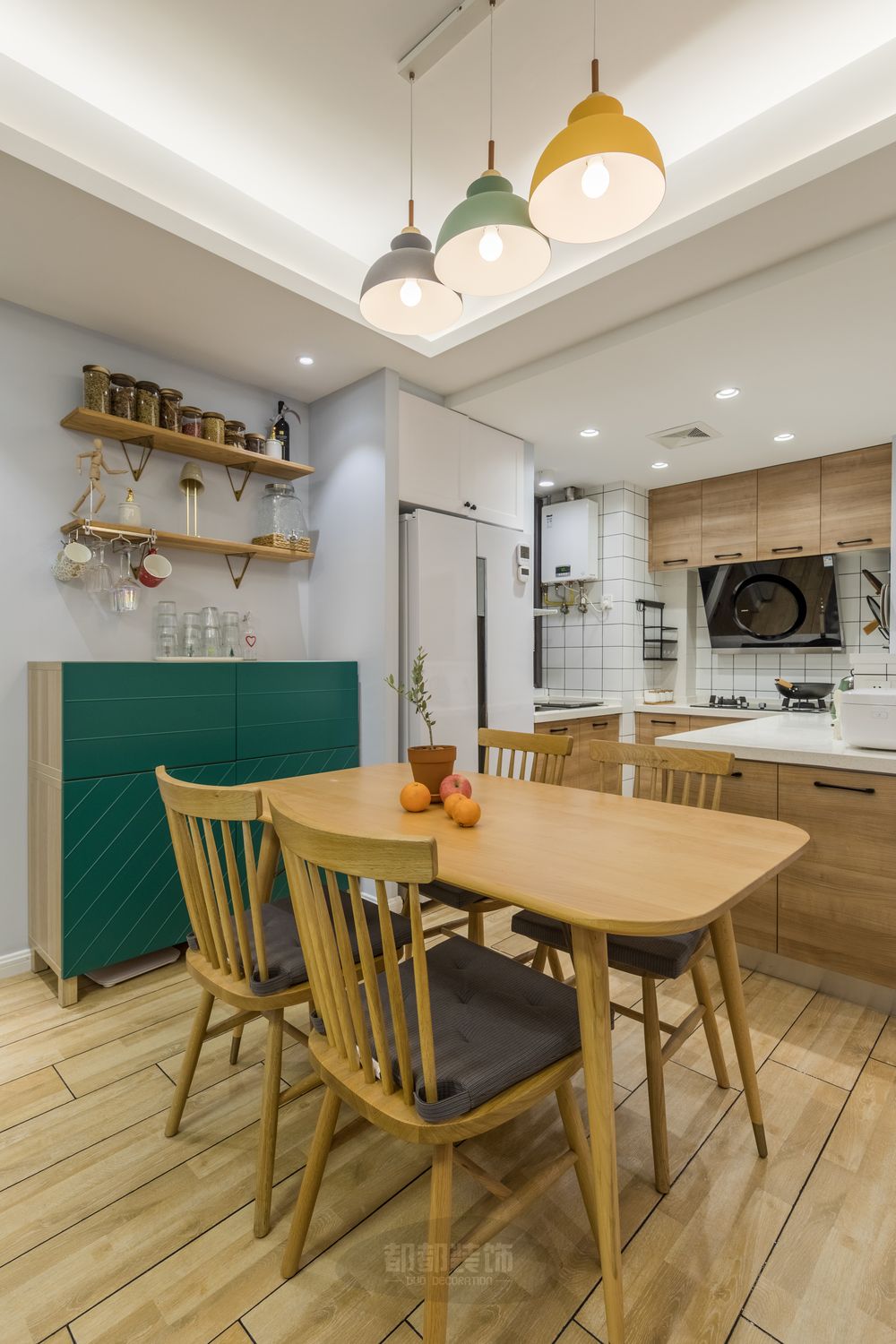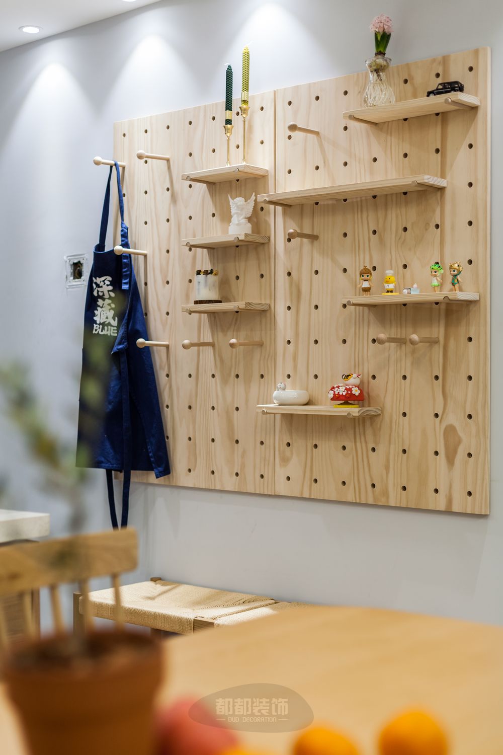 ▲墙上的木质块装饰大幅度节省了储物空间,并添入不少具生活质感的家具软装,交织出兼具美观,舒适的质感视野,增添了生活乐趣。餐厅区域深绿色储物柜与挂画贯穿了客厅的深绿色沙发,相得益彰。