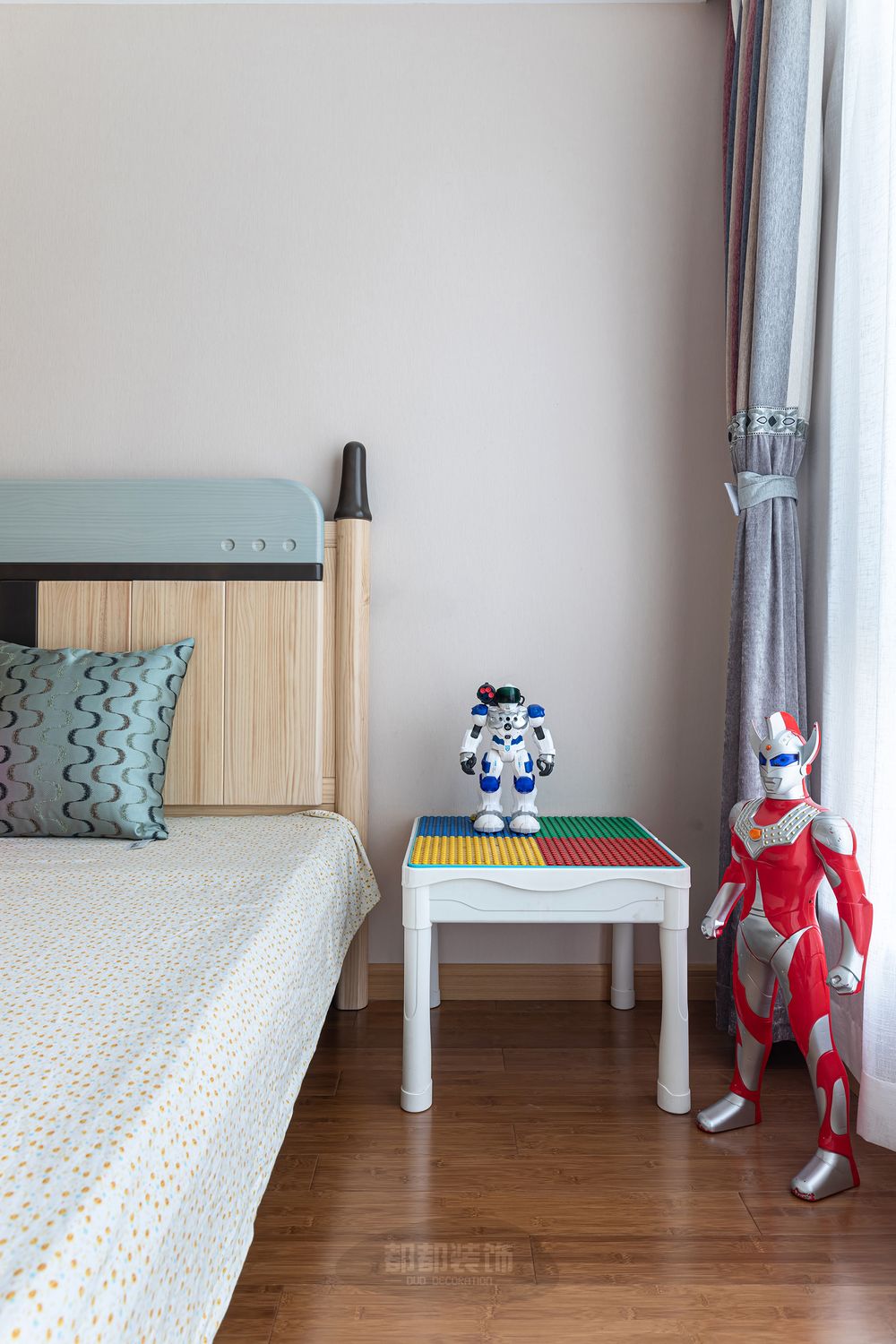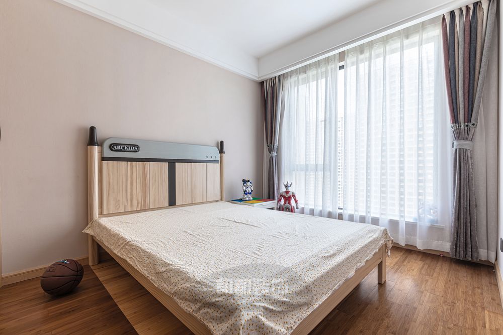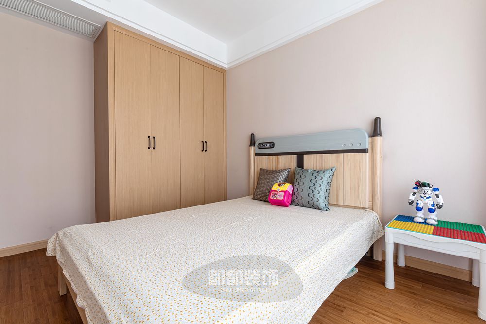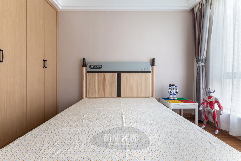 ▲ 儿童房整体延续主卧清新素雅的空间感,木质衣柜与米色床品,给人舒适放松的氛围,小孩喜欢的玩具加以点缀,多了几分童趣。