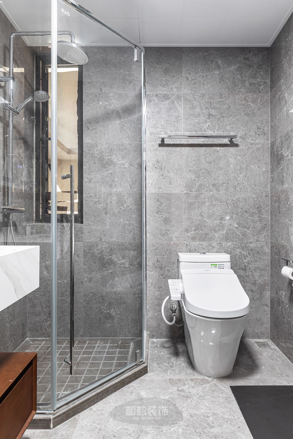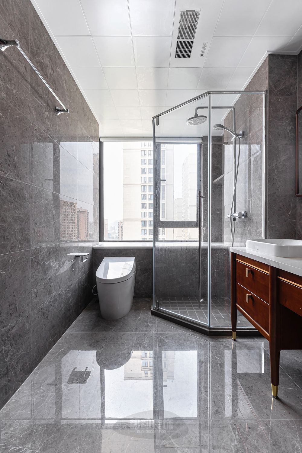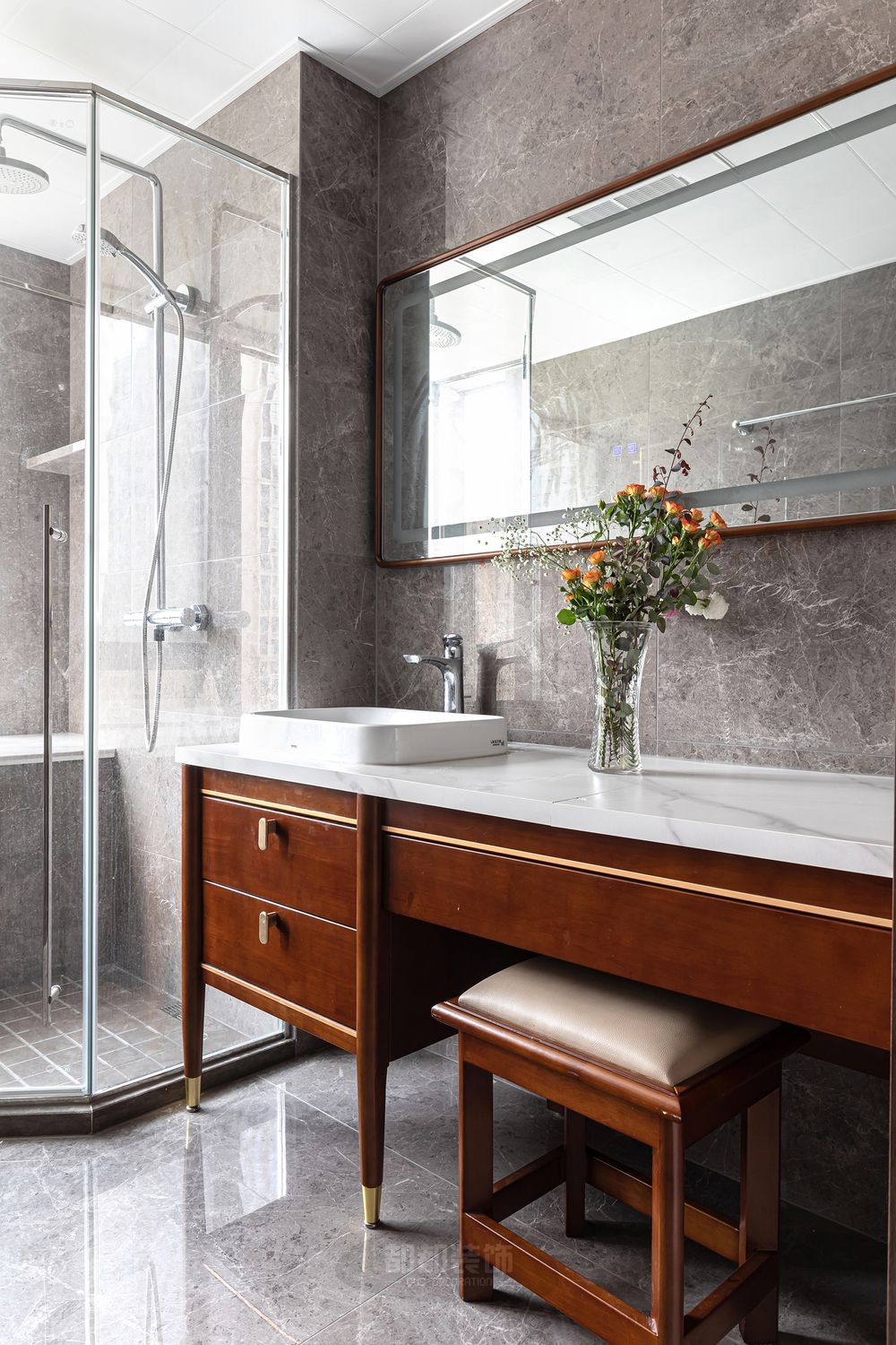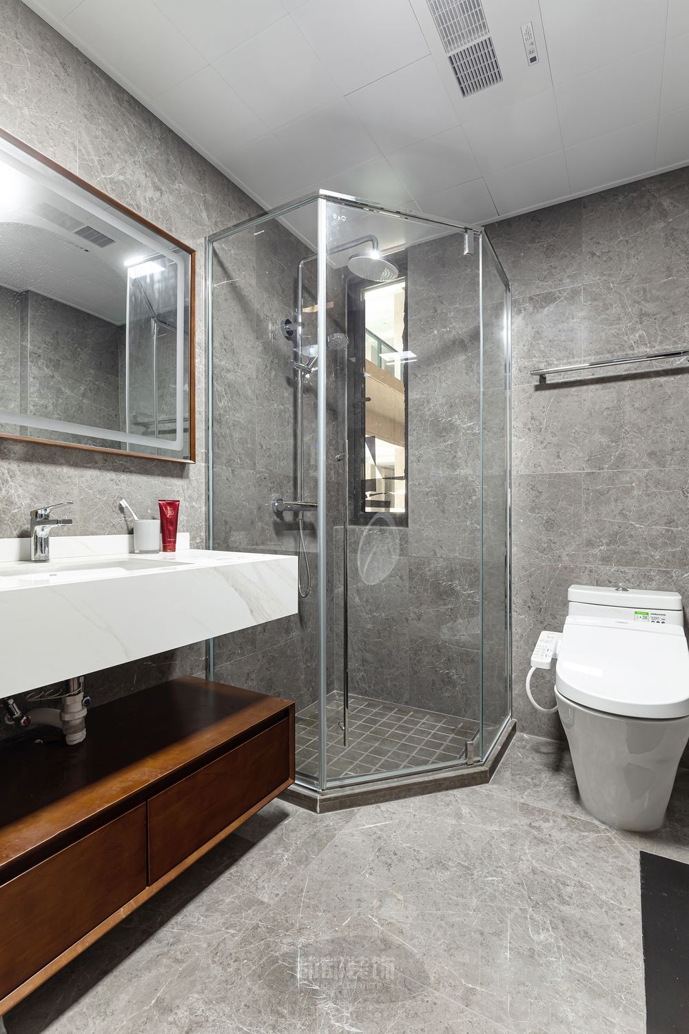 ▲ 卫生间做了干湿分离,大理石瓷砖现代利落,分区利用了玻璃隔断,简洁直观,视觉清爽,洗脸台做了双层悬空处理,下方的实木储物柜满足卫生间的储物功能。
