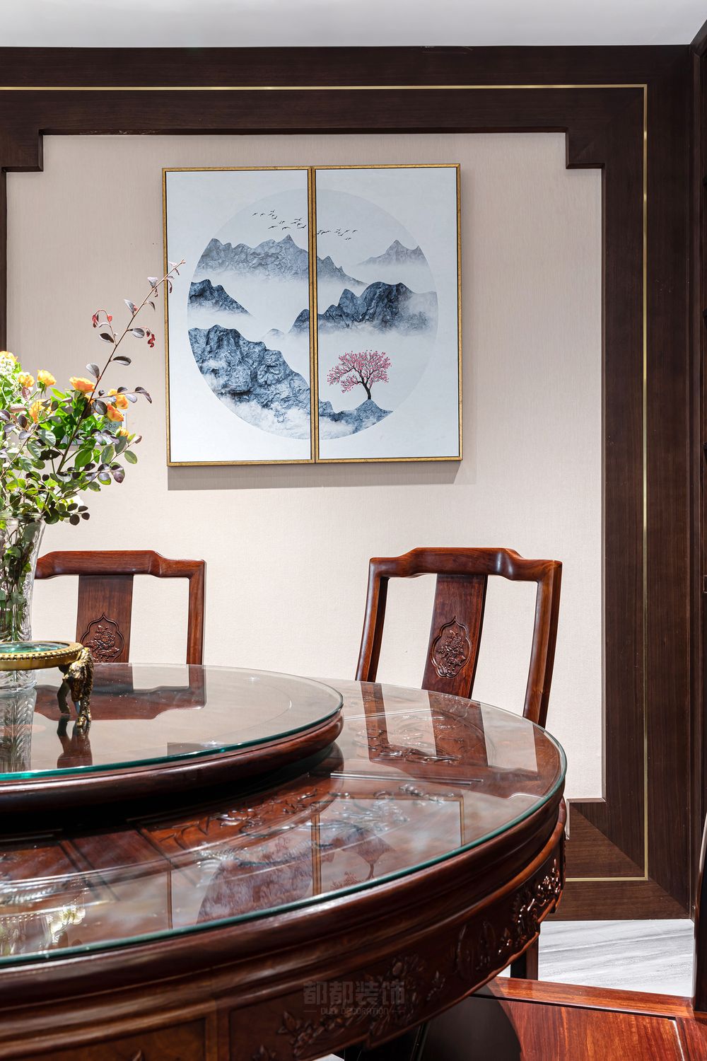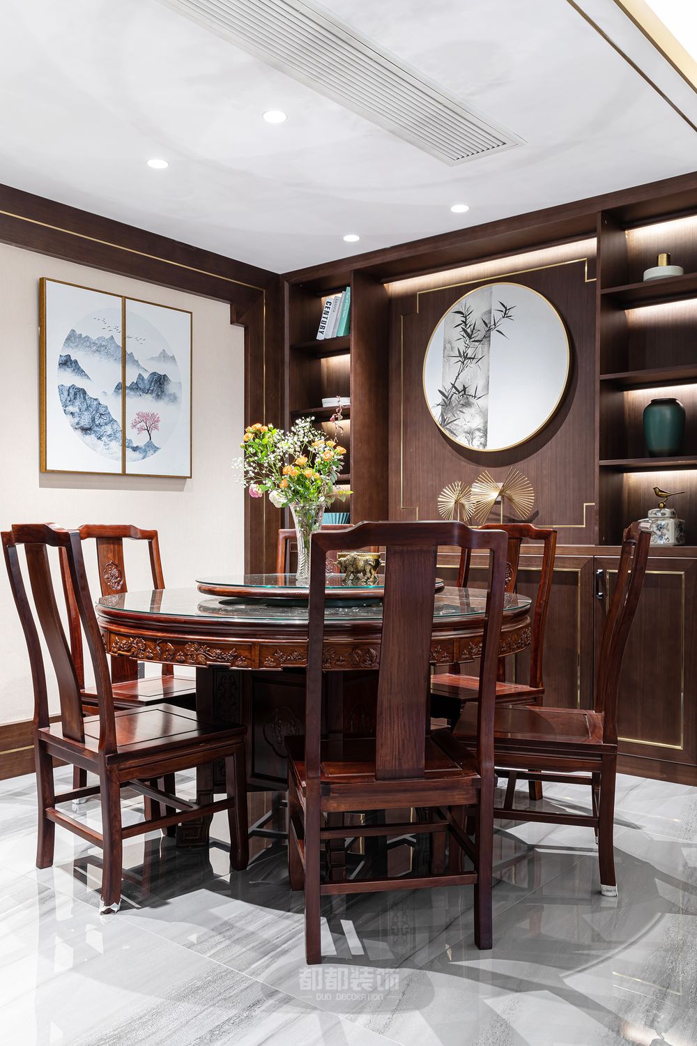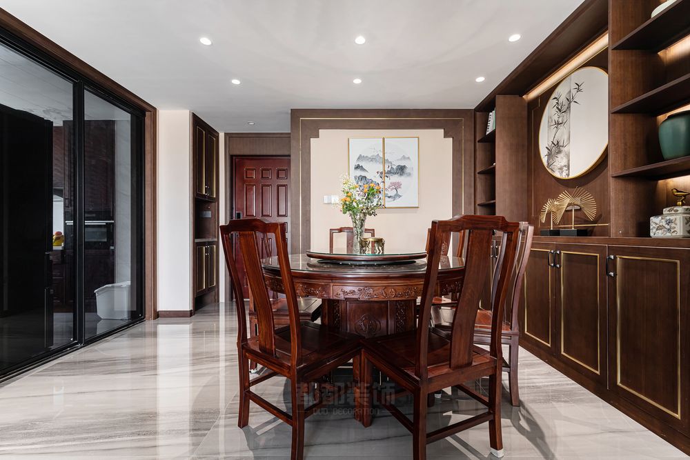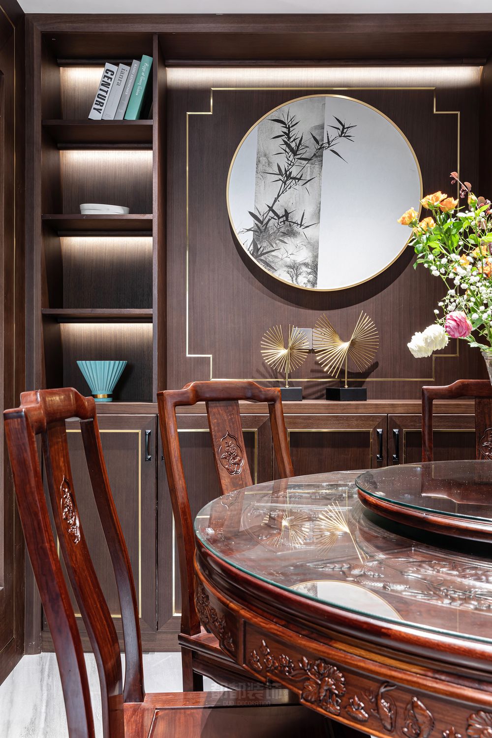 ▲ 餐厅做了无主灯设计,柔和灯光的铺设下,整个空间多了几分温馨韵味,圆形的餐桌更符合东方人的生活习惯与文化传统,增设现代化的博物架,使餐厅不显局促笨重,另用挂画做部分点缀。