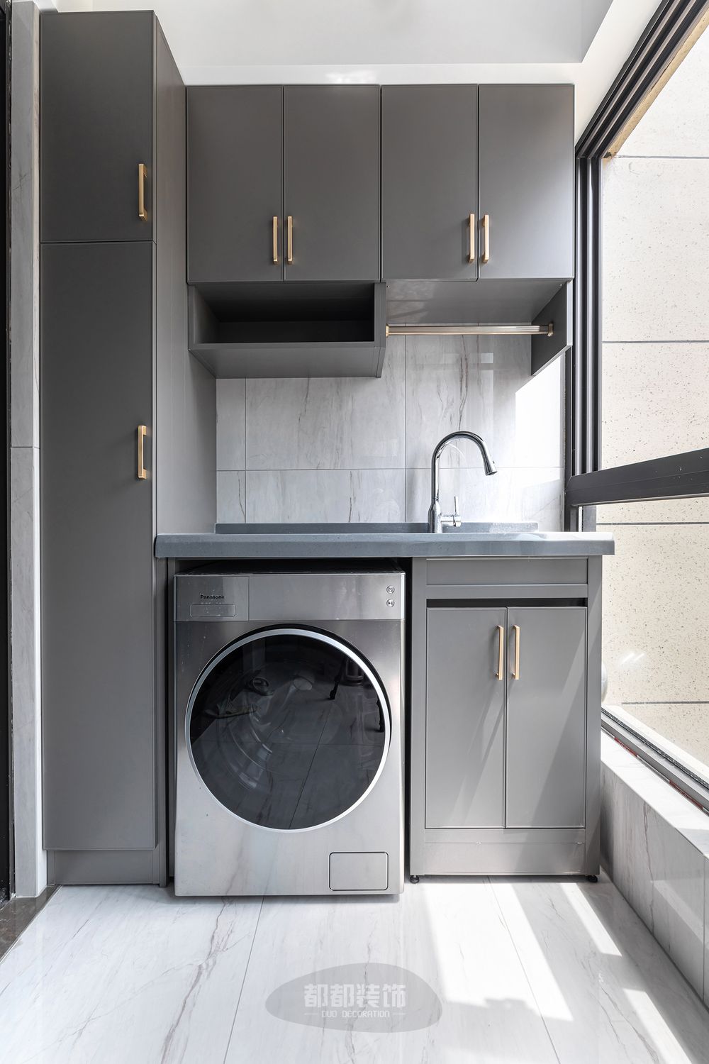 ▲ 阳台设计洗衣机烘干机区,考虑到搓洗方便,把洗烘设计在两边,同时增加拖把区,使整个空间的实用。