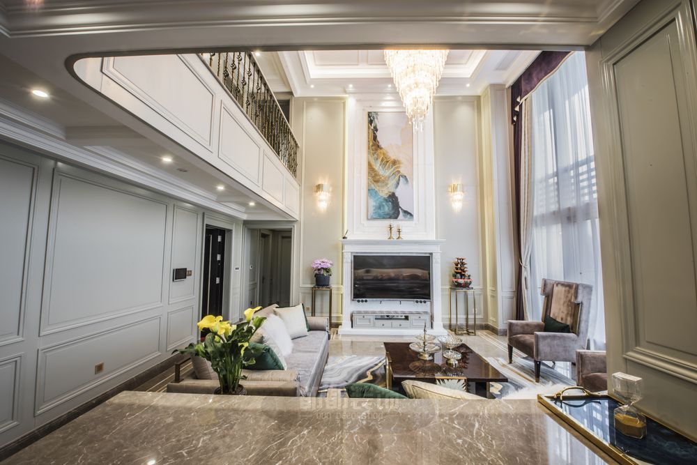 ▲ 中空挑高的设计带来绝佳的视觉感官,落地窗承接着阳光的洗礼,极具流动线条感的大理石墙面,使整个空间干净简洁,呈现出隽永典雅的风格。