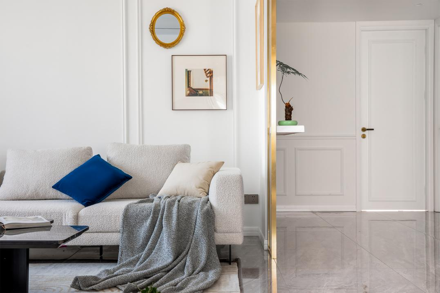 入目是流淌在空间中的温柔奶油色、色调优雅却不过分甜腻,精致的挂画,立体的石膏线,浅色系的搭配清爽阔绰,细节处点缀以克莱因蓝的抱枕,浪漫又不失时尚。