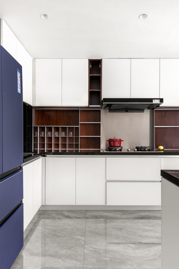 厨房U型设计,中西厨功能俱全,隐藏式收纳设计仅仅有条,黑白搭配清爽明净,褐色实木镶嵌其中多了几分自然清新。在原有的设计中,根据屋主的习惯,在操作台对面规划出一个储物柜,拜访一些小型电器方便的不得了。