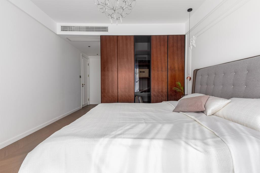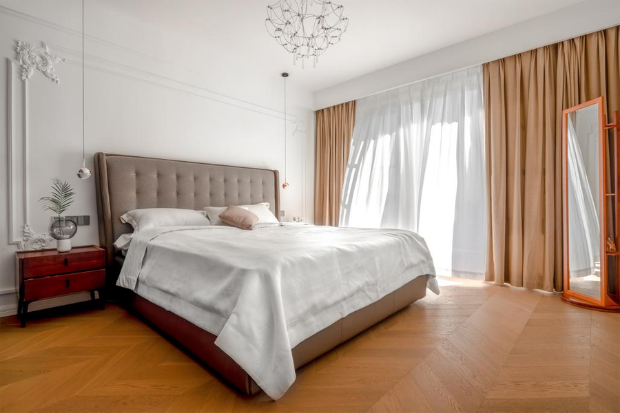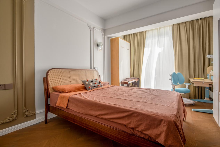 主卧大面积用了经典浪漫的驼色,纱帘的奶油雾感,不影响采光也保证隐私,充满浓郁法式风的人字拼地板,为整体空间增加了流动的美感。