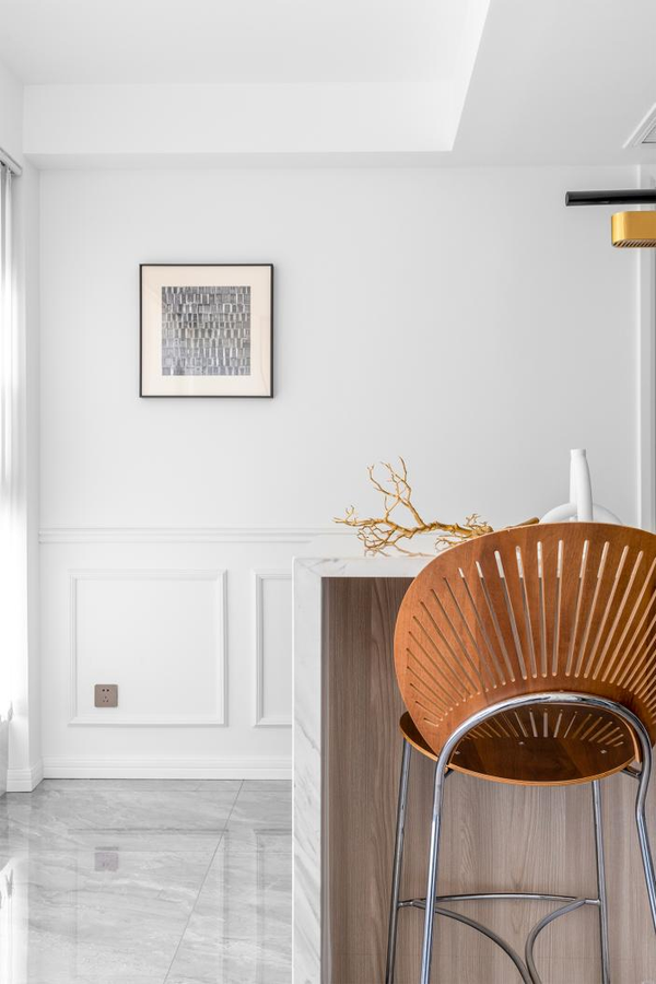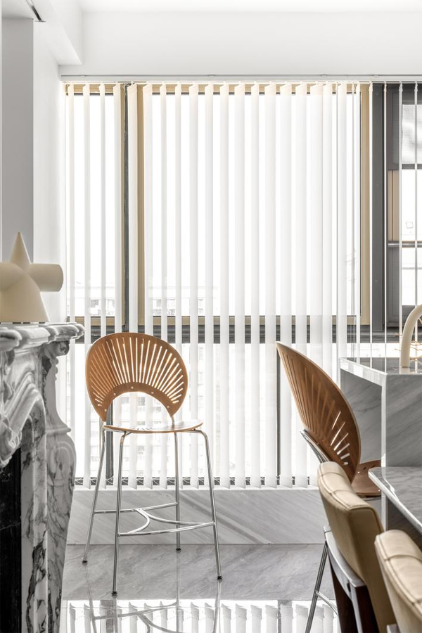 餐厅另加了吧台,贝壳椅轻盈设计感极强,大理石吧台不论是传菜置物还是沐浴在晨光下吃早饭,都非常的有仪式感。