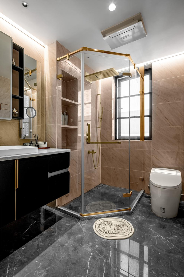 浴室也是满满的法式强调,干湿分离,金框玻璃门轻奢优雅,镜柜和壁龛,镜柜样式极简,设计巧妙,细节感满满。