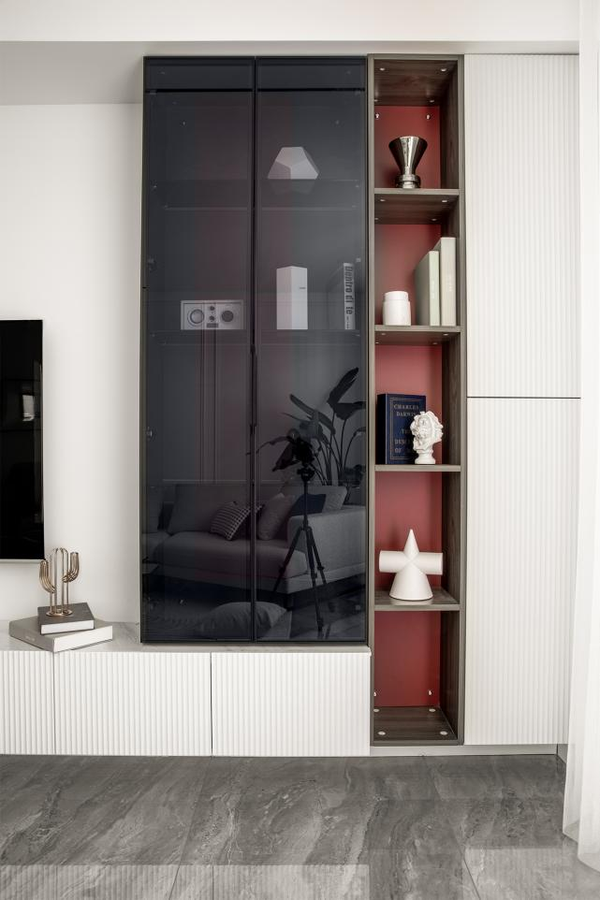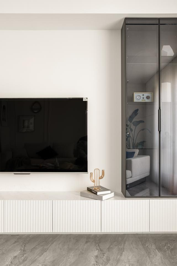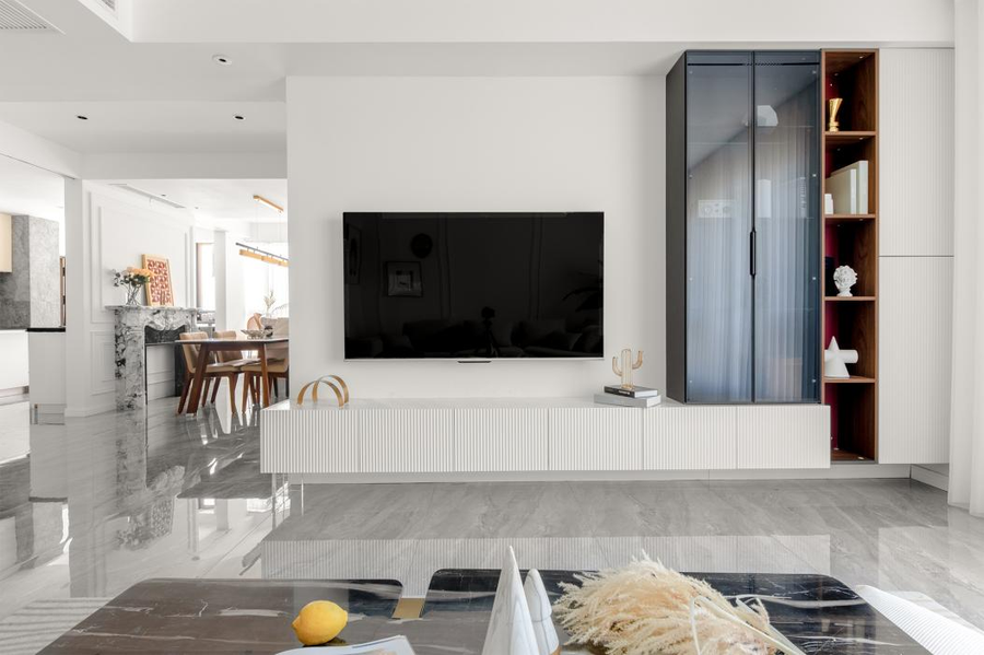 大白墙给人以目无杂色的视觉感官,细腿电视柜凸显了空间的轻盈感,右侧展示柜里摆放着书籍、艺术膏像等,搭配以隐藏灯带,营造出雅致个性化的轻奢空间。