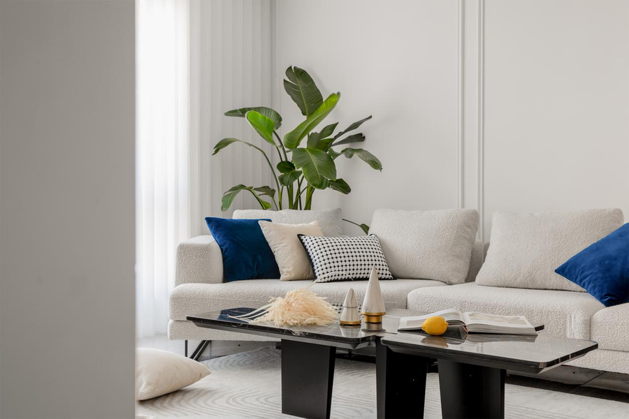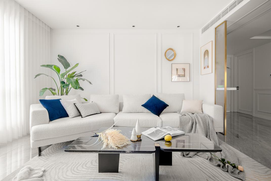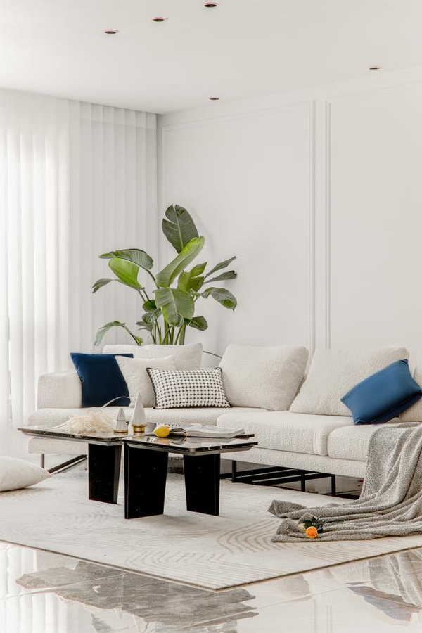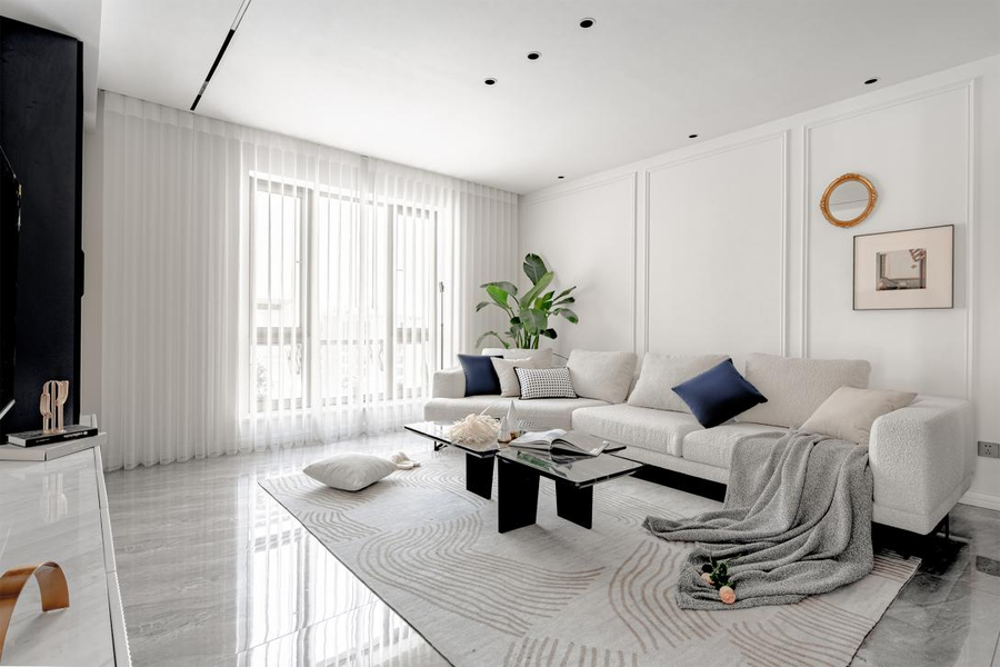 奶白的墙面,大理石地板、素雅的窗帘,羊毛球材质的沙发,还有客厅中央超大的地垫,用纯粹的流动线条装饰出了简约古典的韵味,空旷自然。