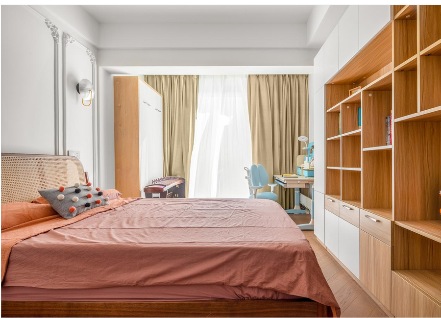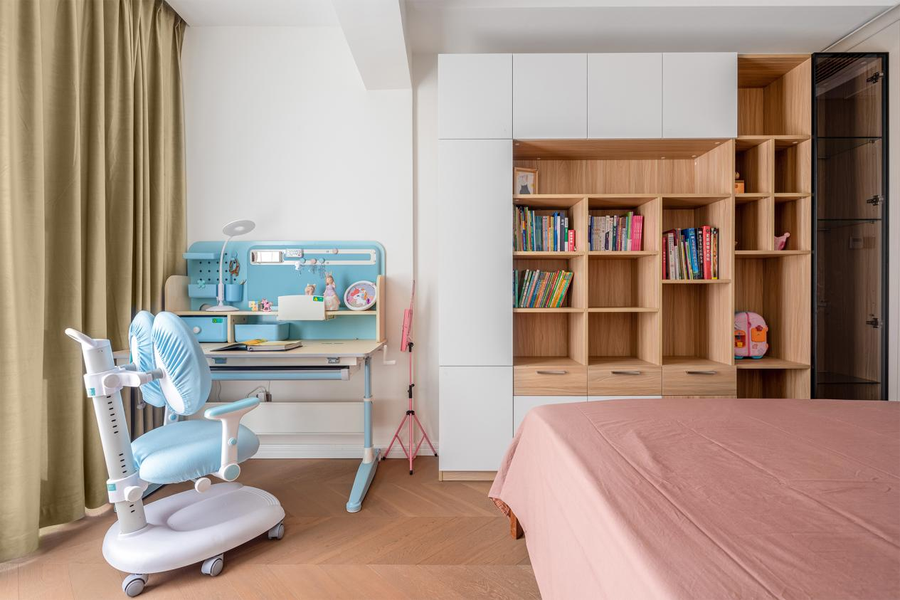 女儿从小学古筝,装修风格也很有文艺范儿,一整面墙的储物柜摆放着孩子的五颜六色的童话书,即使长大后,也不会缺乏储物空间。